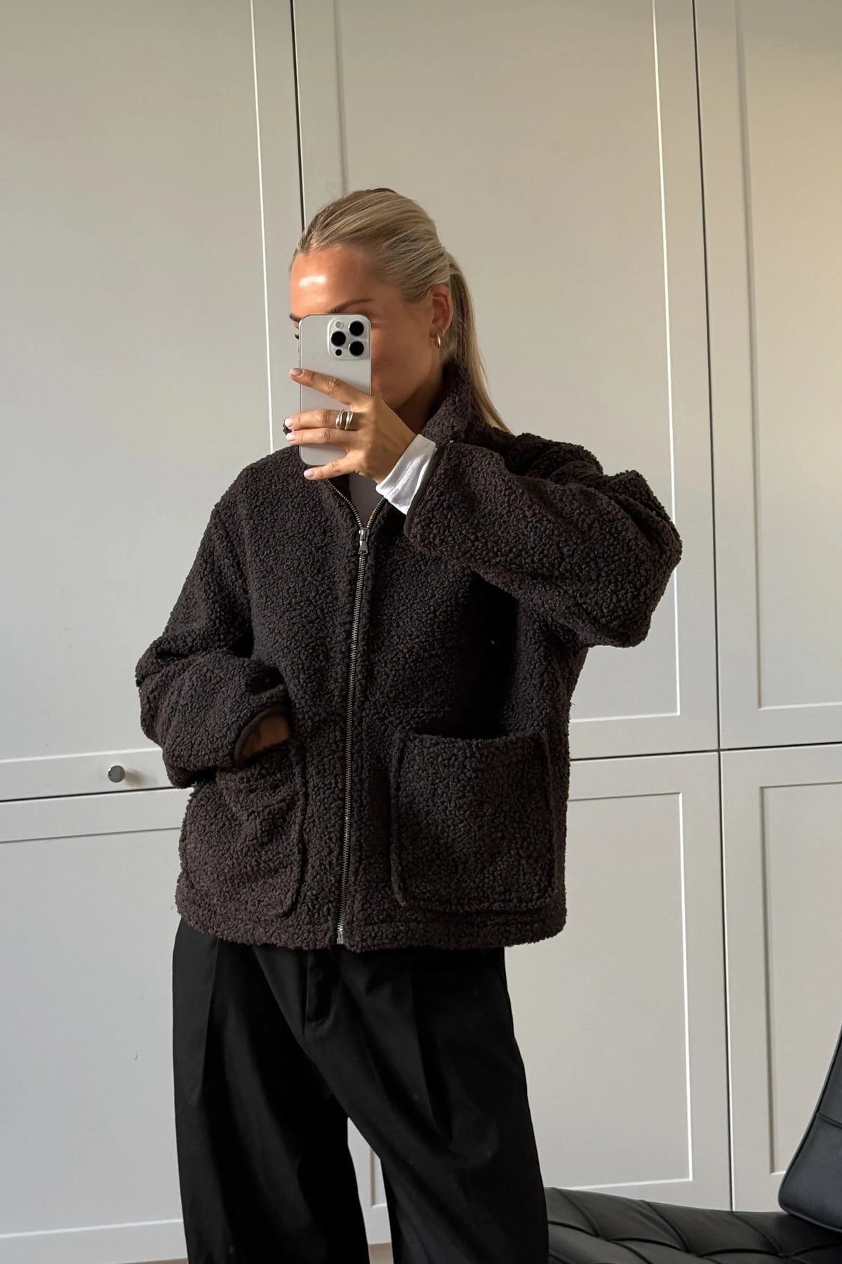 Jakke fra Noella i brun chokoladefarve. Jakken er lavet af blødt teddystof med en fluffy tekstur og har en højhalset krave.