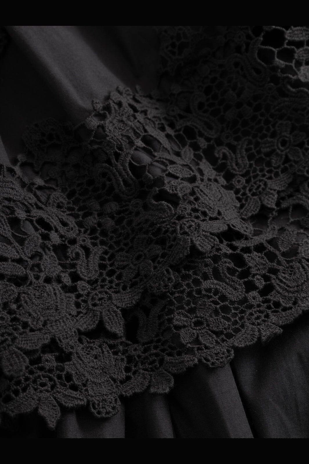 Sort kjole fra Noella med broderi, blonder og flæser. Kjolen har en høj hals, 3/4-lange ærmer og en ankel-lang nederdel.