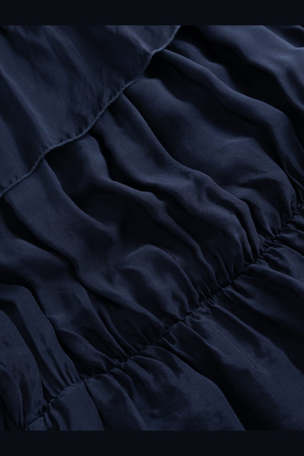 Mørkeblå bluse fra Noella, lavet af 70 % viskose og 30 % silke. Blusen har lagdelte flæser og en åben, elastisk halsudskæring.