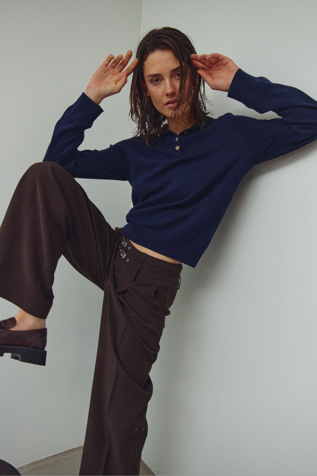 Striktrøje fra Noella i mørkeblå. Trøjen har klassisk polo-design med knaplukning foran og en strikket struktur med afslappet pasform.