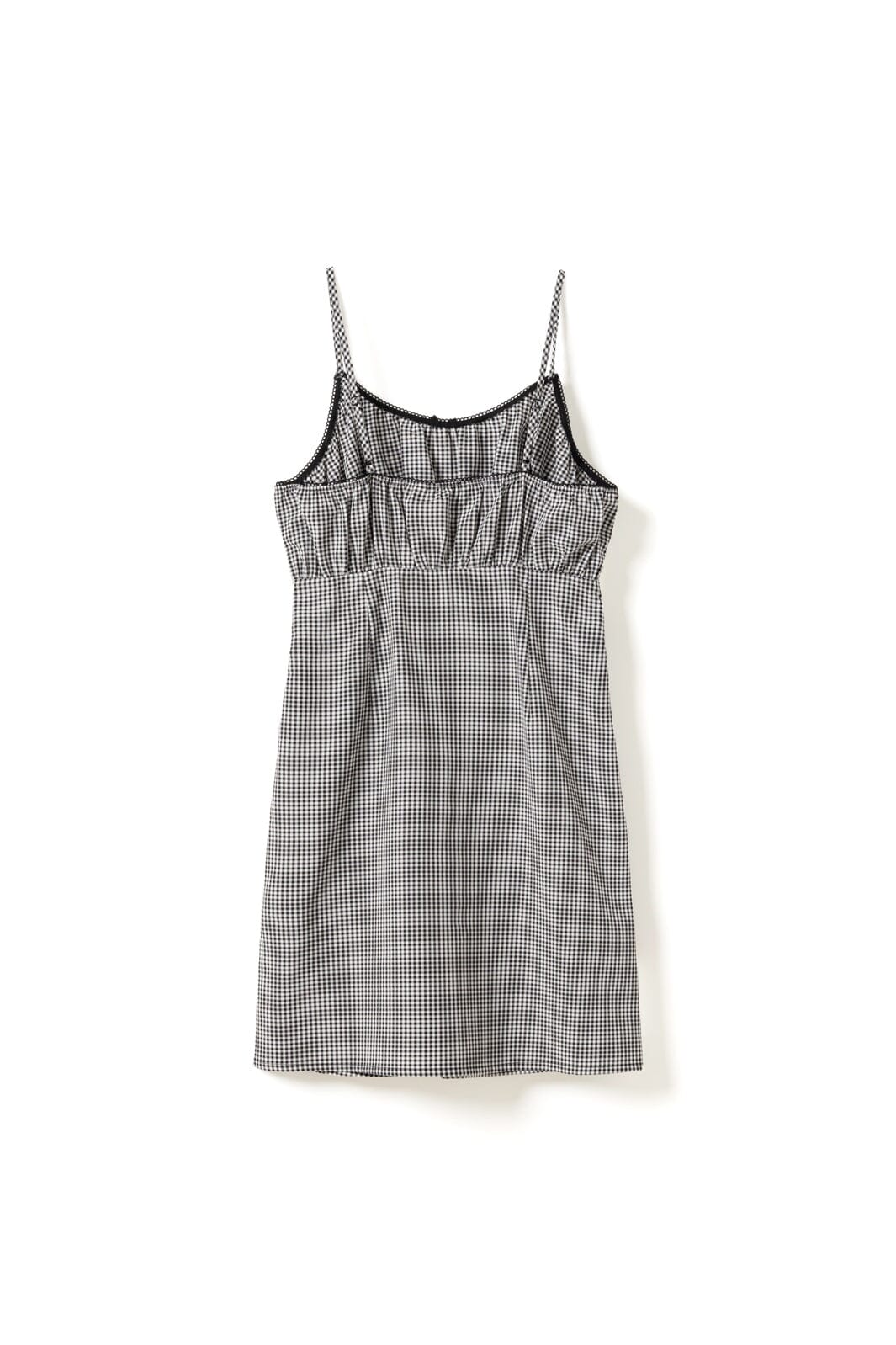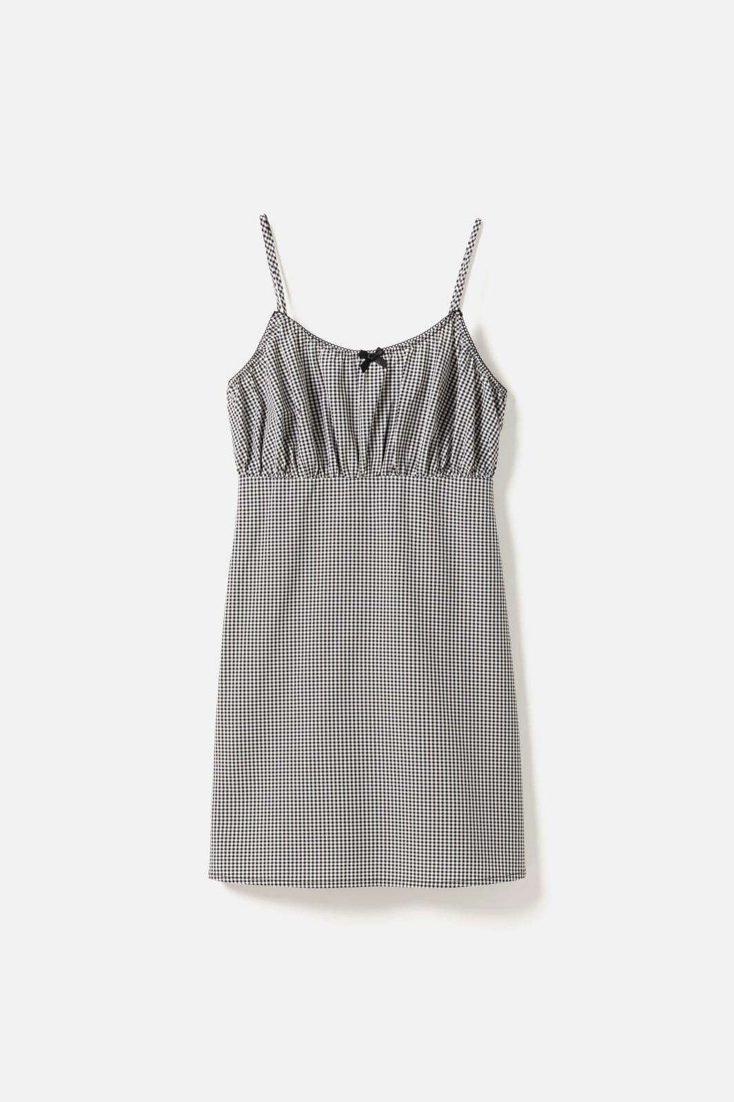 Ternet kjole fra Noella med sort-hvidt mønster. Kjolen har tynde stropper og en sløjfe foran i midten. Den er skåret under brystet med rynker øverst.