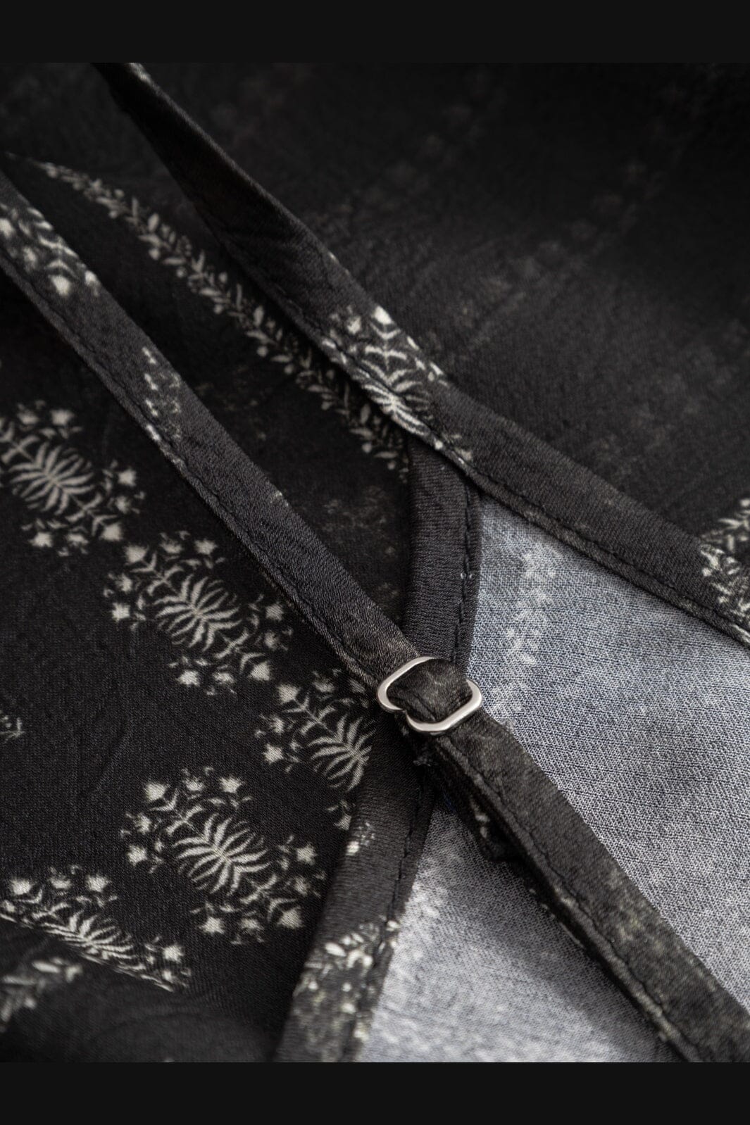 Sort kjole fra Noella med geometrisk print og blomsterdetaljer. Kjolen passer til både hverdagen og festlige lejligheder.