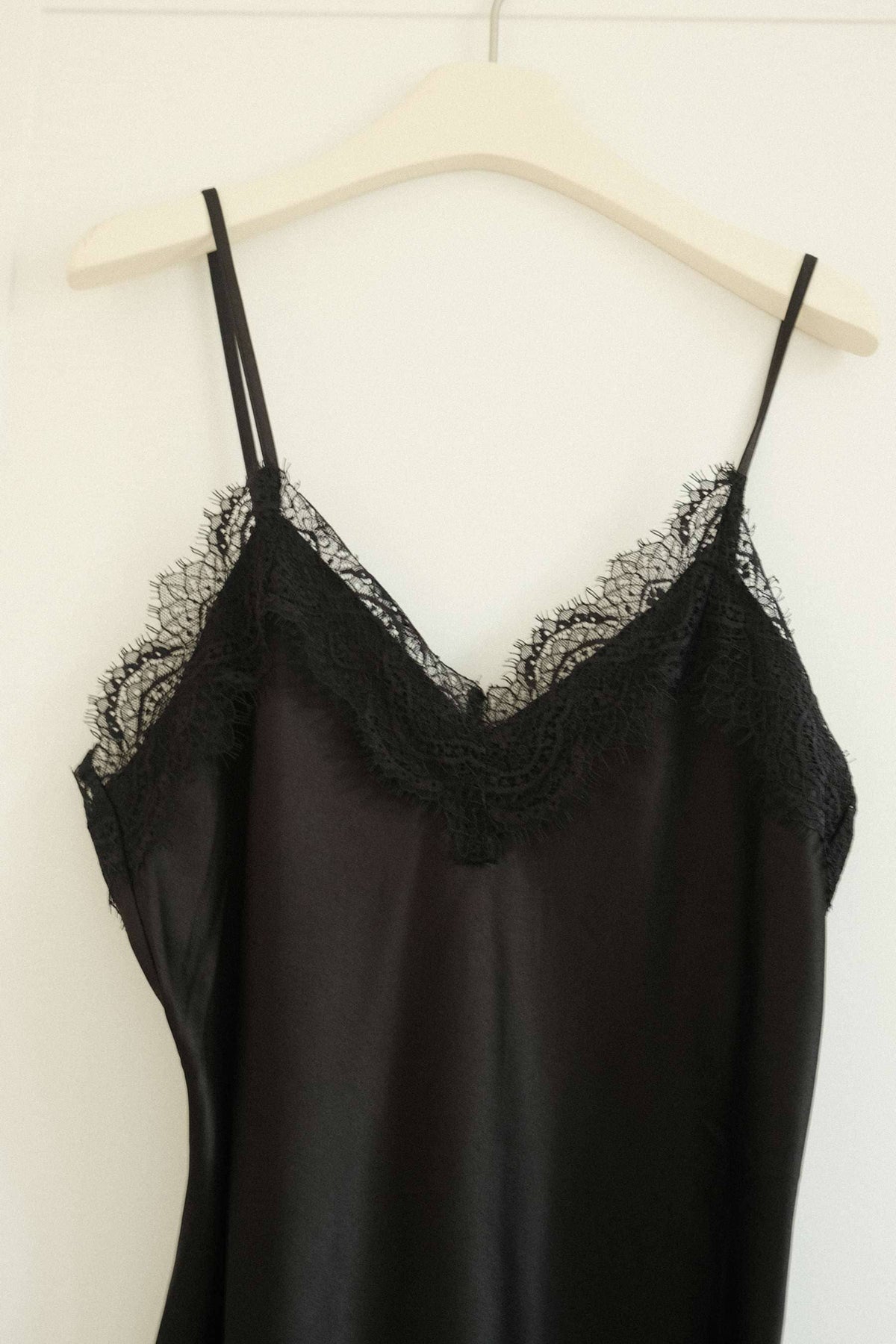 Sort kjole fra Noella i satin. Kjolen har tynde, justerbare stropper, blonde detaljer og en asymmetrisk kant, der går til knæet.
