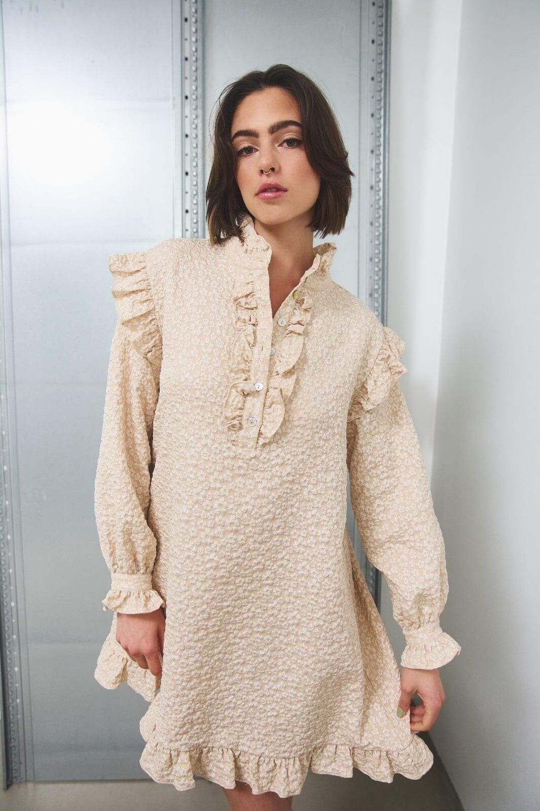 Kjole fra Noella i en lys oysterfarve med blomstermønster. Den har høj hals med flæser, knapper foran og lange ærmer med flæsekanter. Kjolen afsluttes med en flæset kant forneden.