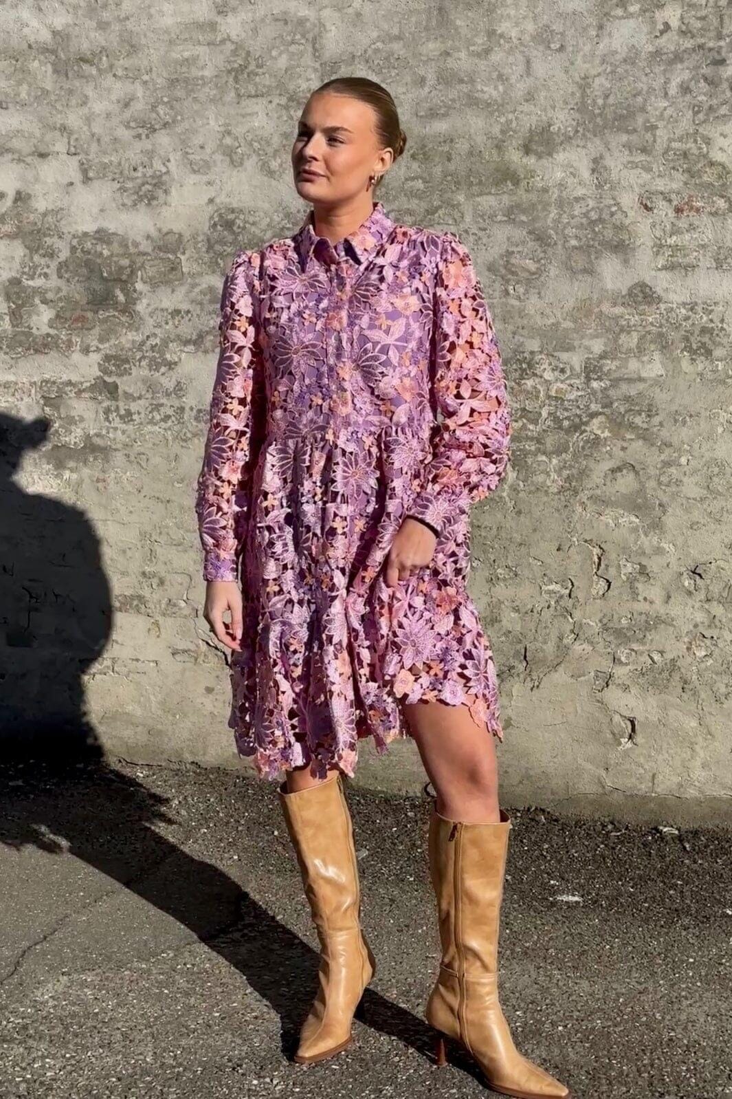 Blondekjole fra Noella i lilla mix med orange og pink blomstermønster. Kjolen er lavet af kraftig blonde med flæsedetaljer og har skjortekrave samt lange ærmer.