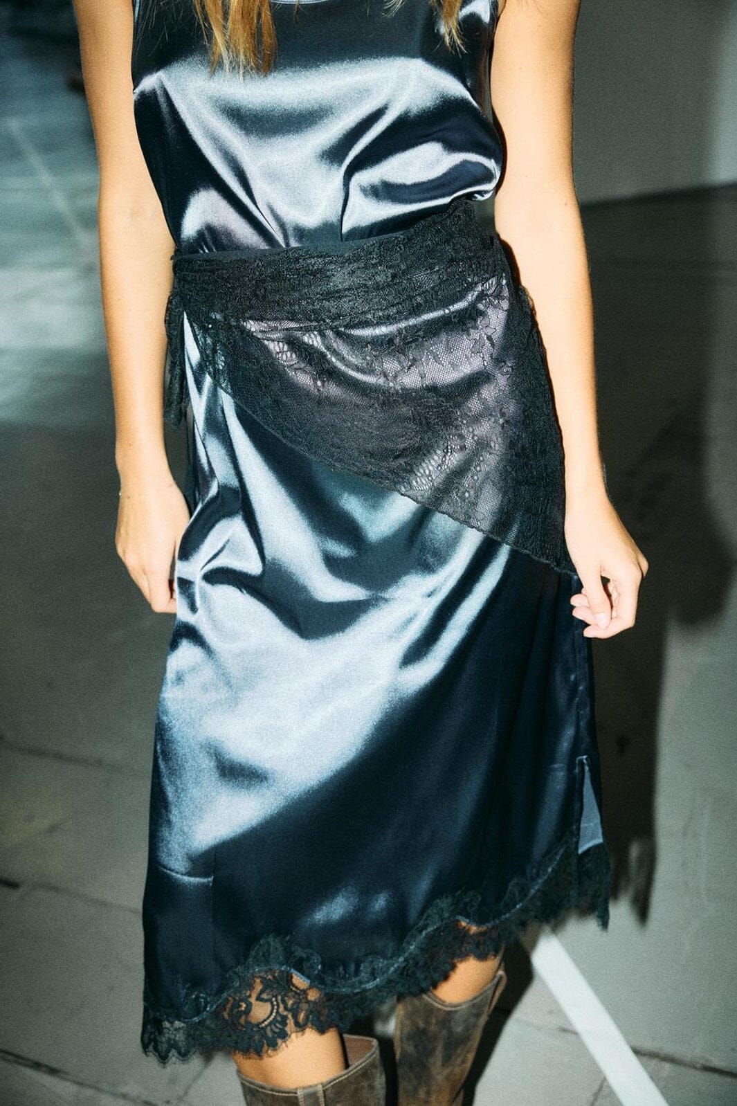 Sort slå-om-nederdel fra Noisy May med blonde langs kanten. Nederdelen har en skinnende overflade og bindes i taljen med en snøredetalje.