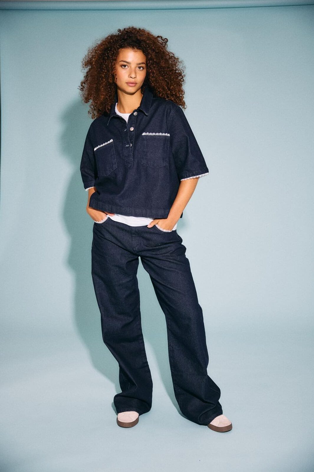 Mørkeblå denimskjorte fra Noisy May med polokrave og 3/4-ærmer. Skjorten har blondedetaljer langs lommerne og knapper foran.