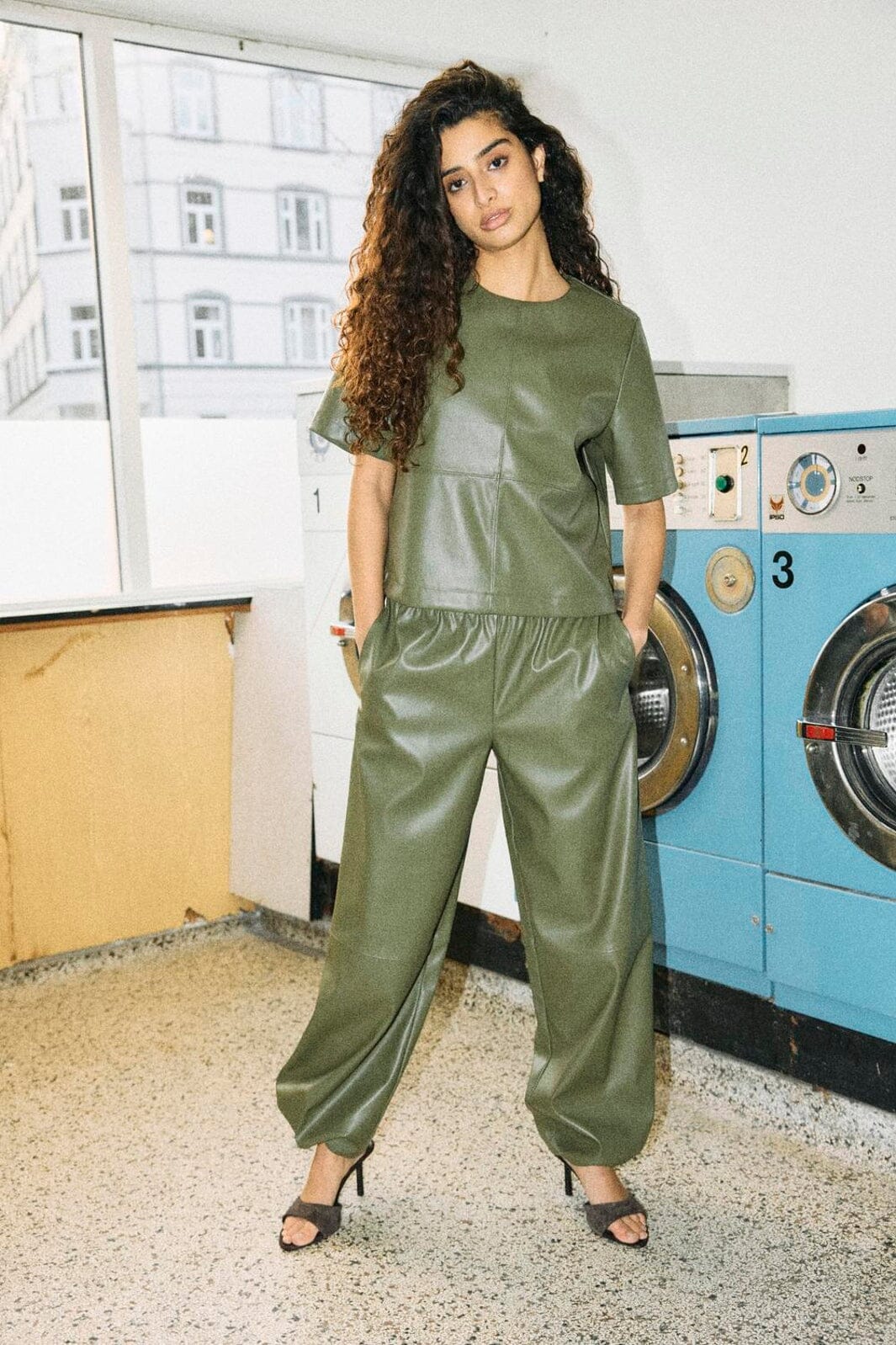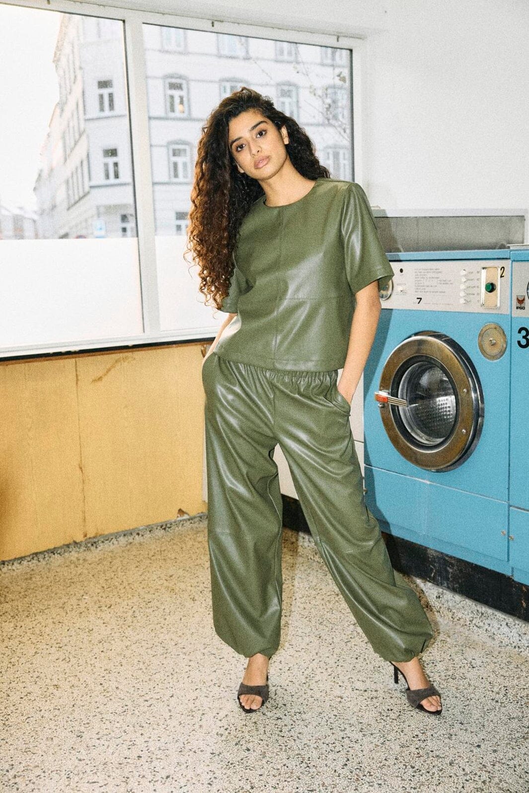 Kortærmet top fra Noisy May i khaki grøn med glat overflade og polyurethanbelægning. Toppen har dekorative syninger og lynlås på bagsiden.