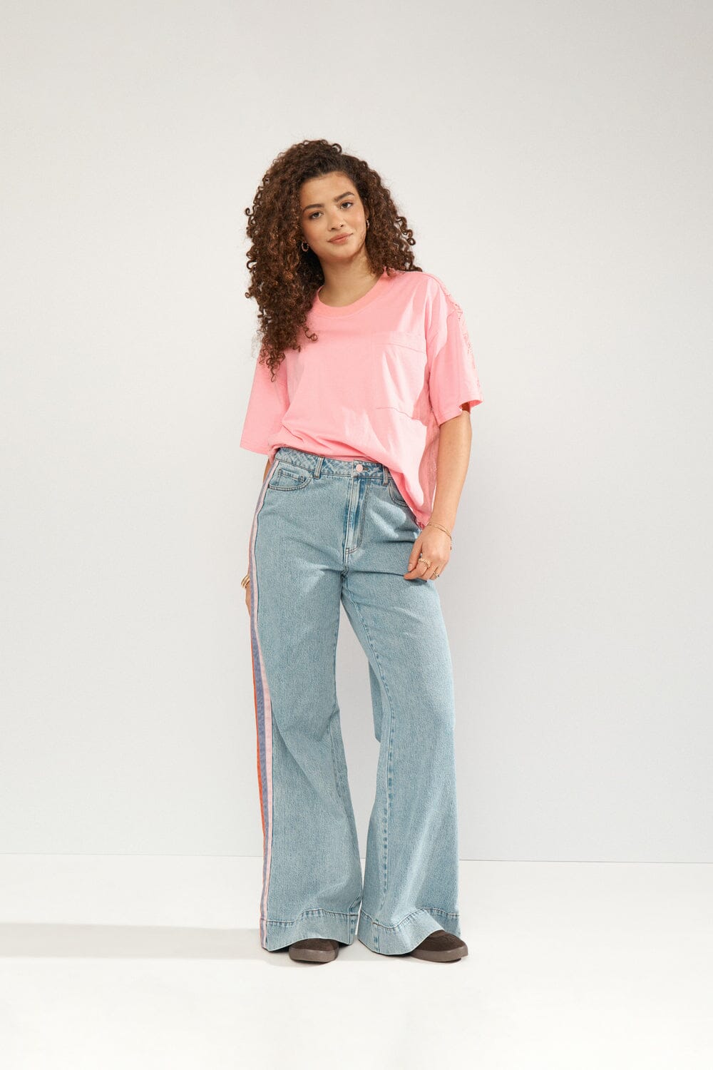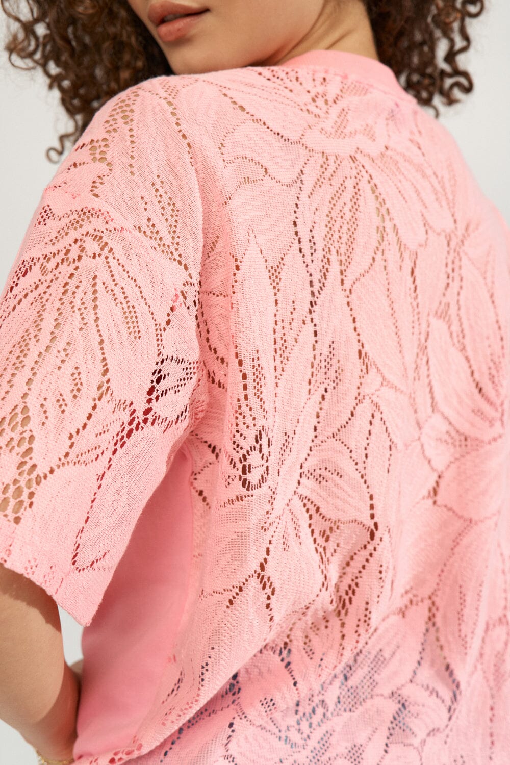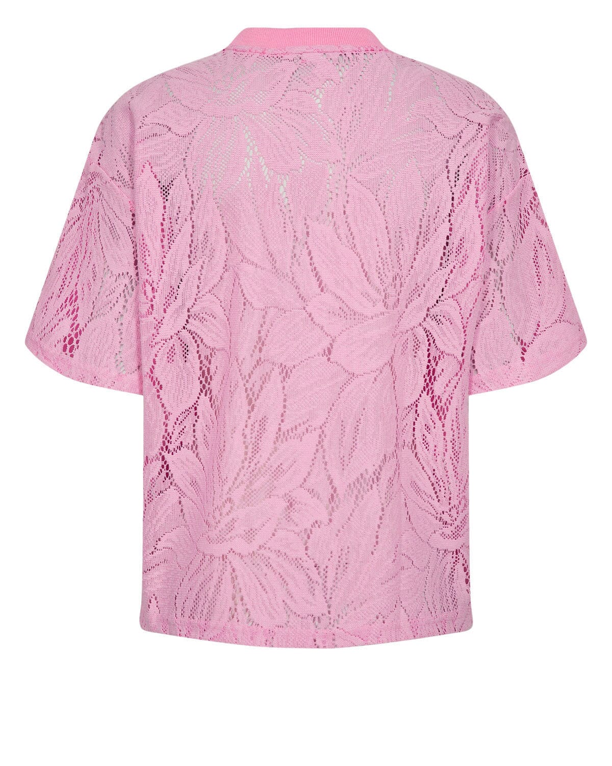 Pink T-shirt fra Nümph med blonder på ærmerne og ryggen. Den har en rund halsudskæring og en brystlomme på forsiden.
