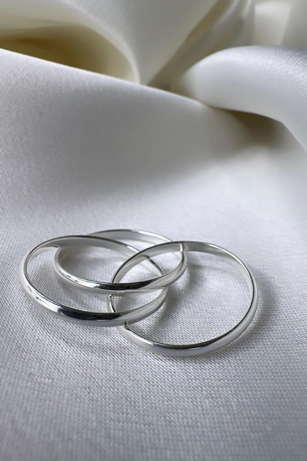 Forsølvet ring fra O element med tre sammenkoblede ringe. Ringen er fremstillet i messing med en blank sølvoverflade, der skaber et rent og minimalistisk design.