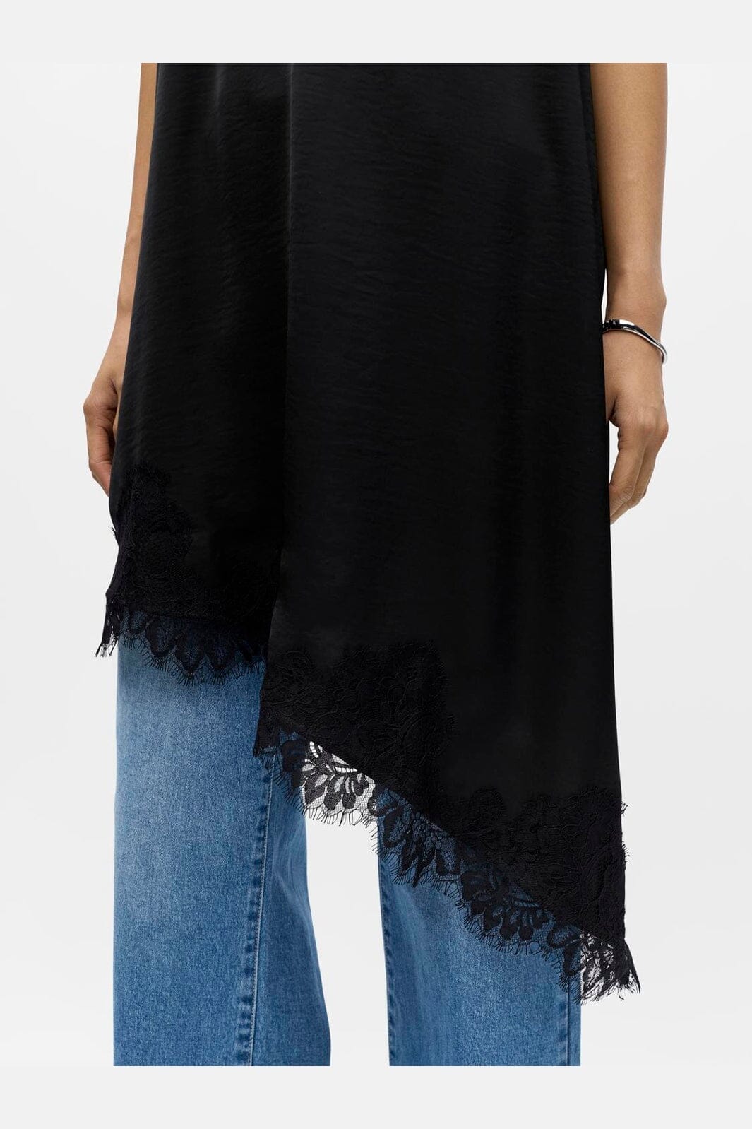 Sort kjole fra Object med blonder detaljer. Kjolen har tynde stropper og en V-udskæring. Den asymmetriske kant og blondekanten giver kjolen et unikt udtryk.