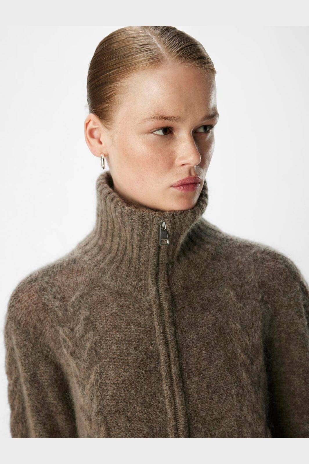 Brun strikket cardigan fra Object med høj hals og lynlåslukning. Den har dekorative syninger og ribkanter ved ærmerne og forneden. Den løse pasform giver god plads til flere lag tøj.