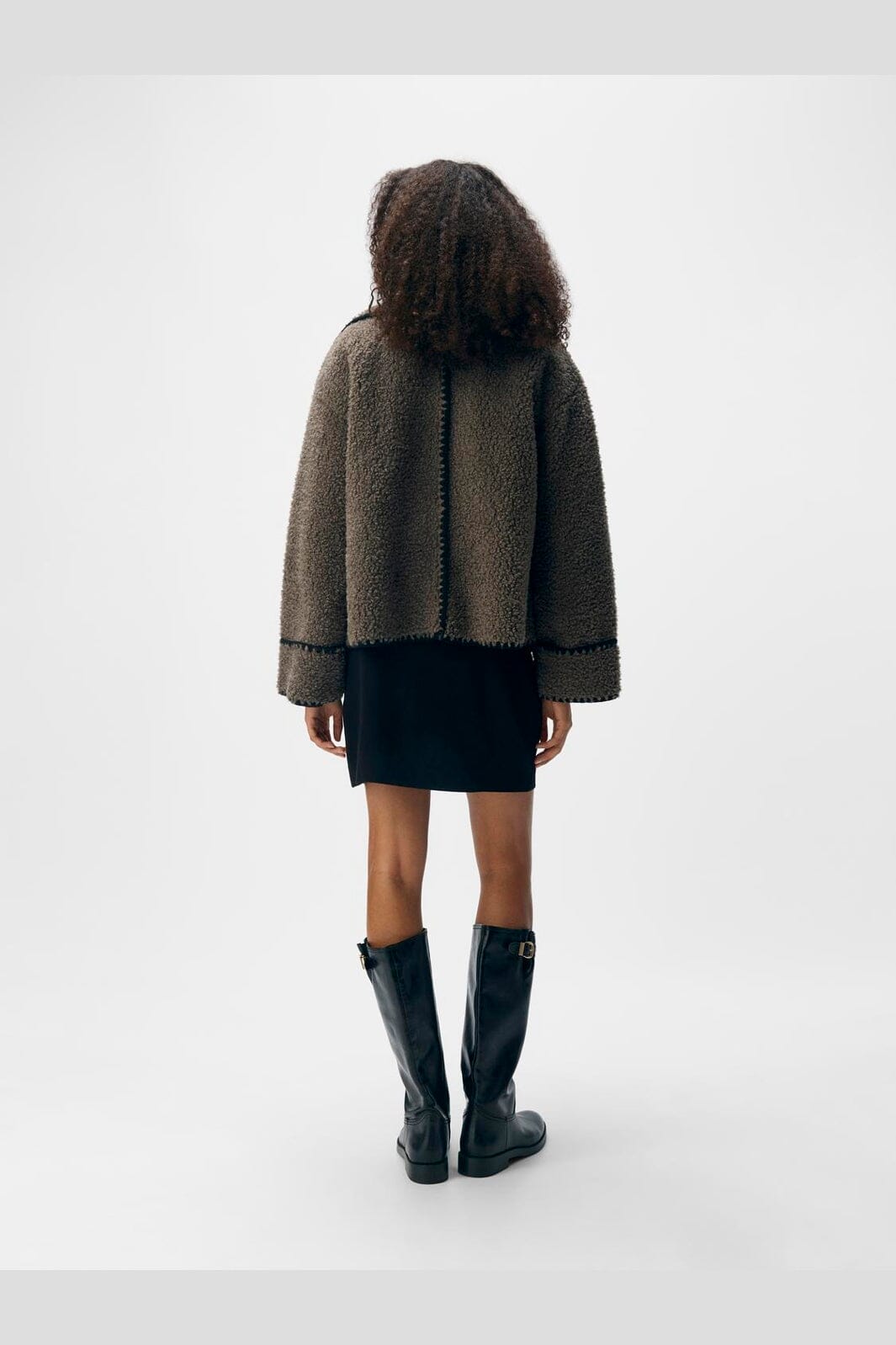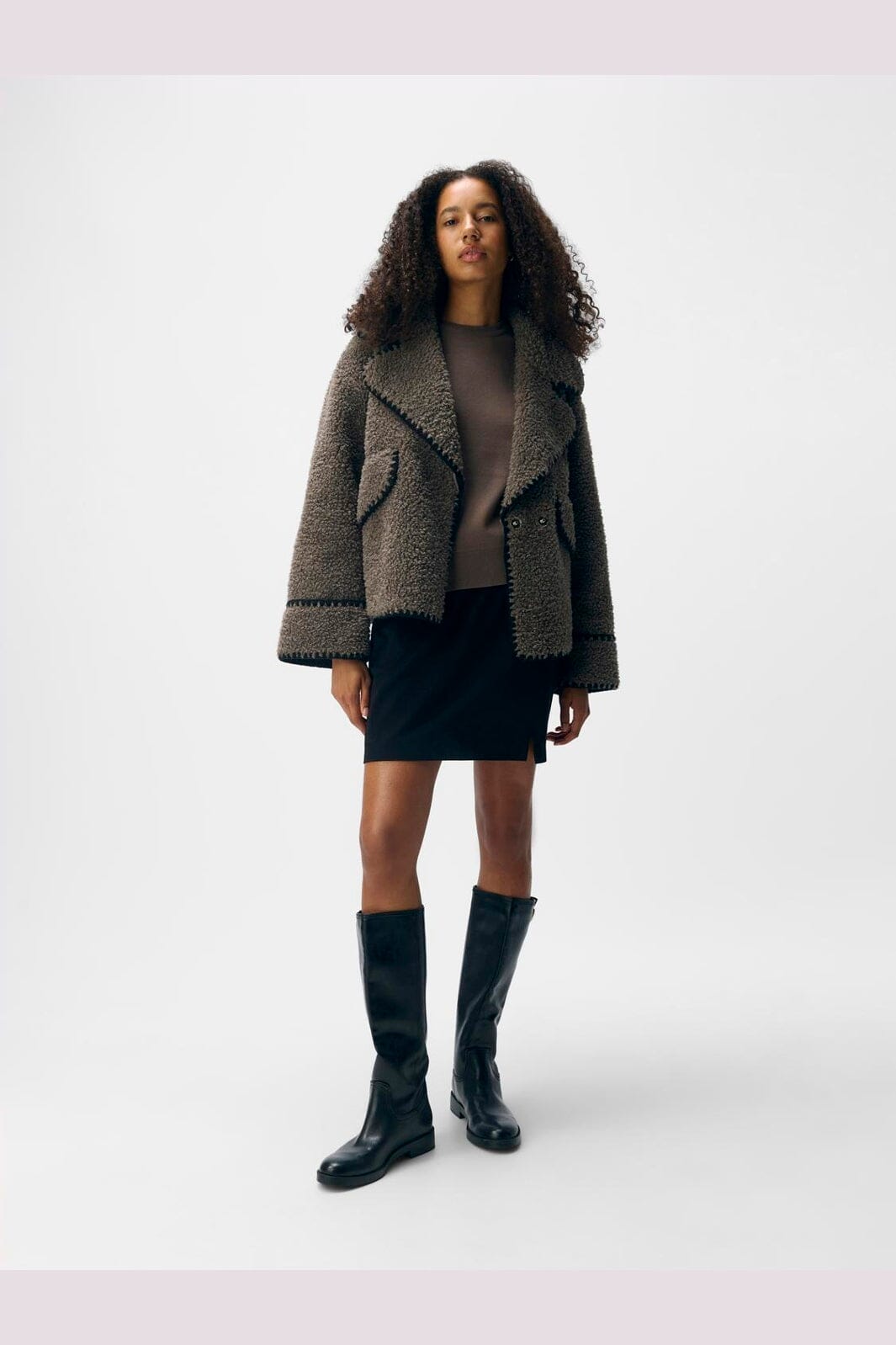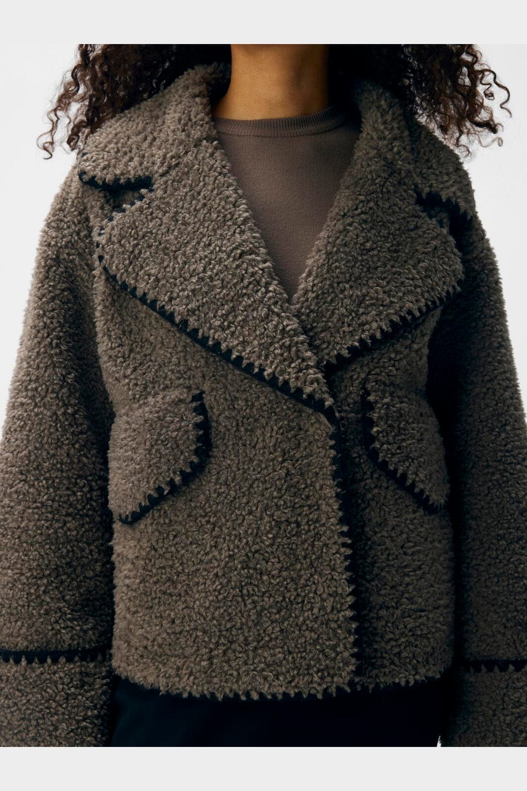 Brun teddyjakke fra Object med stor krave og dekorative syninger. Jakken har en plysset tekstur og lange ærmer med sænkede skuldersømme.