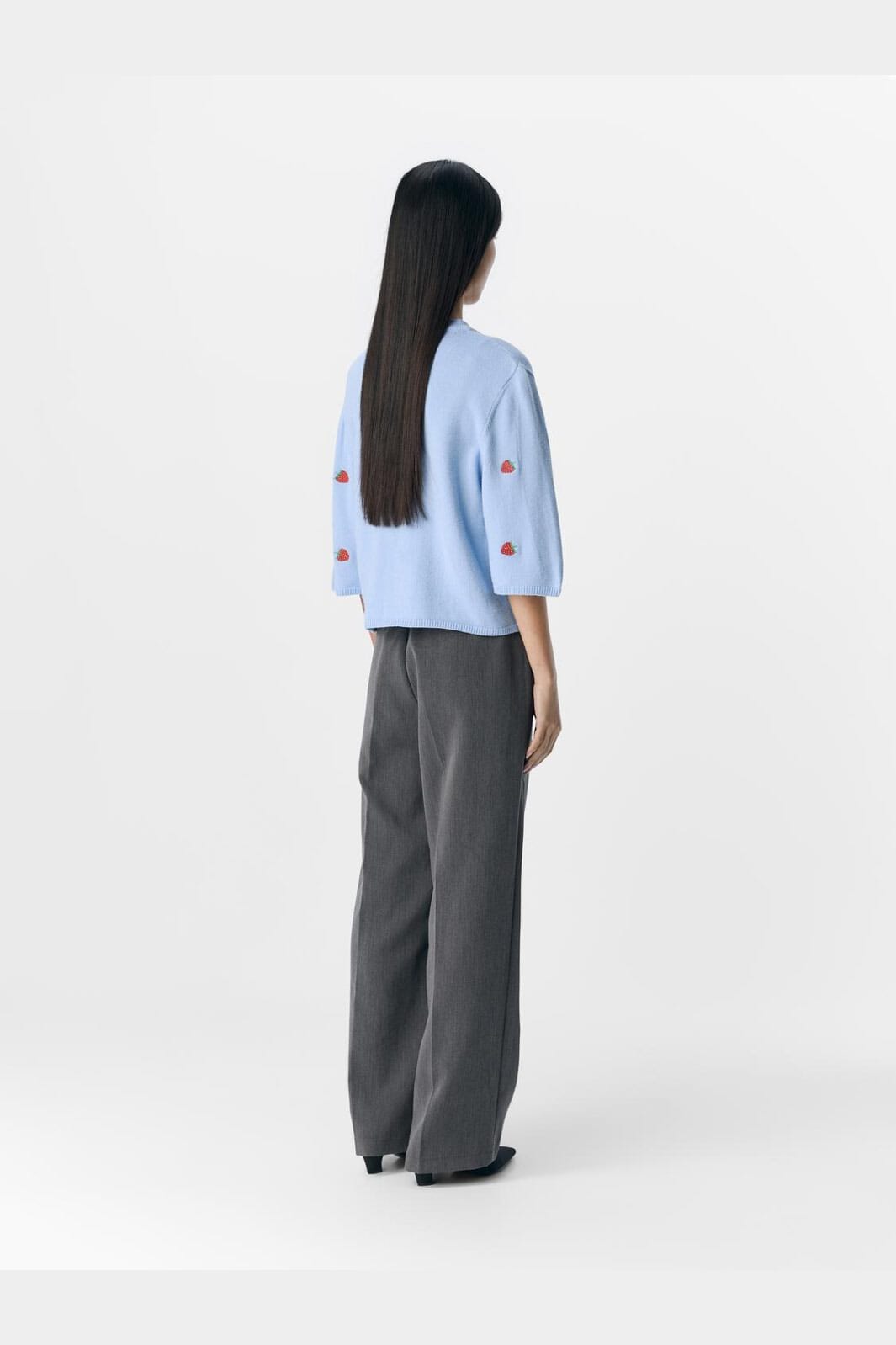 Lyseblå cardigan fra Object med broderede jordbær. Den har rund halsudskæring, knapper foran og 3/4-lange ærmer med ribkant ved manchetterne.