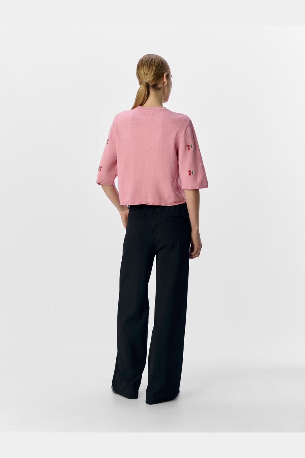 Pink cardigan fra Object med kirsebærbroderi over hele designet. Den har rund hals og 3/4-ærmer med ribkant ved manchetterne. Knapperne foran gør den nem at tage af og på.