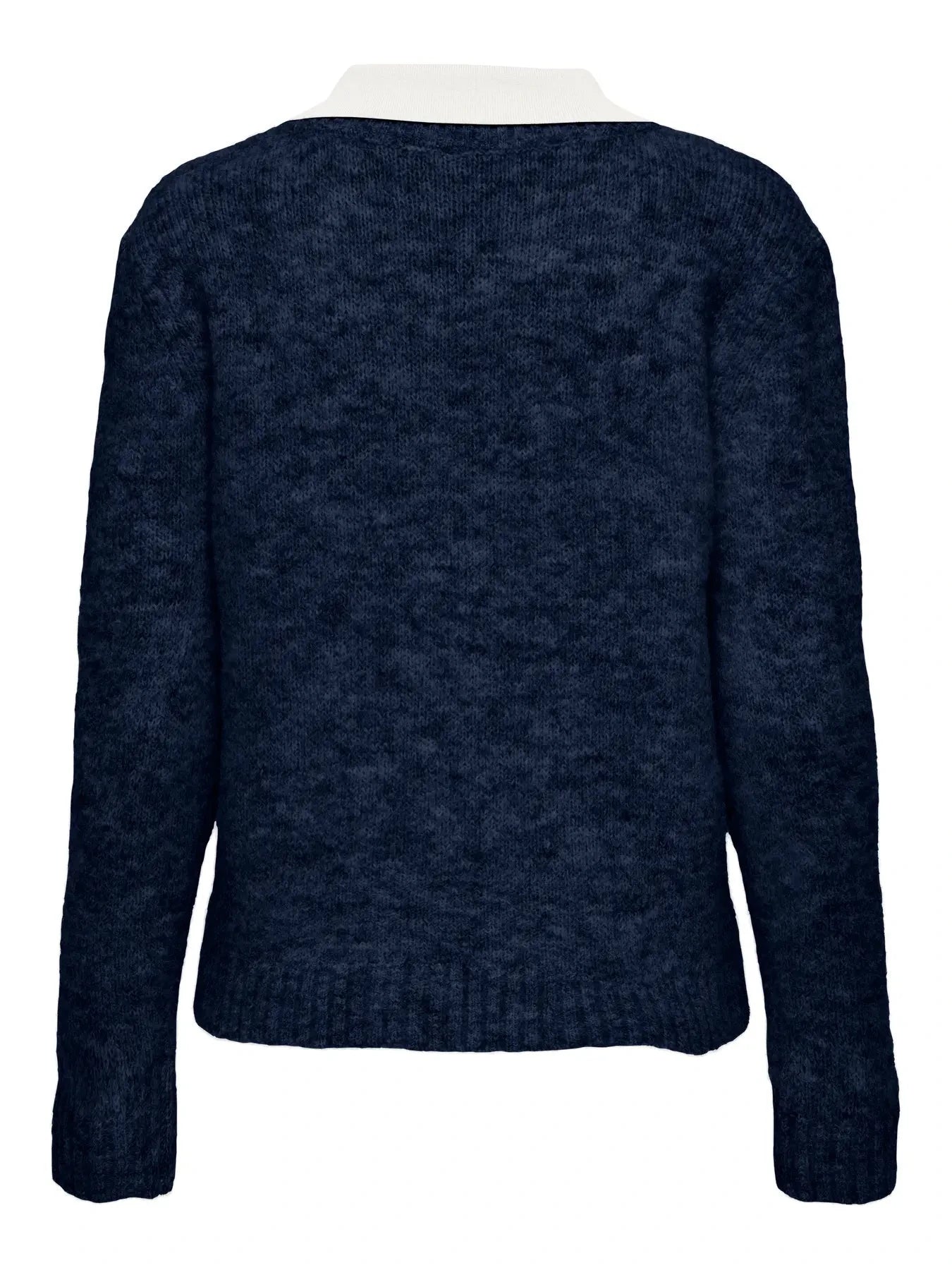 Mørkeblå meleret striktrøje fra Only med en kontrastfarvet hvid polokrave. Trøjen er en pullover i fladstrik med lange ærmer og en løs pasform.