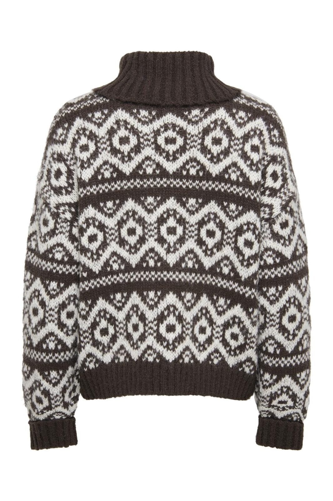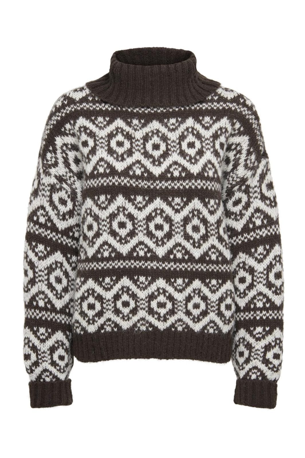 Striktrøje fra Only i mørkebrun med hvidt geometrisk mønster. Den har en løs pasform med sænkede skuldre og en høj rullekrave, der giver god varme til de kølige dage.