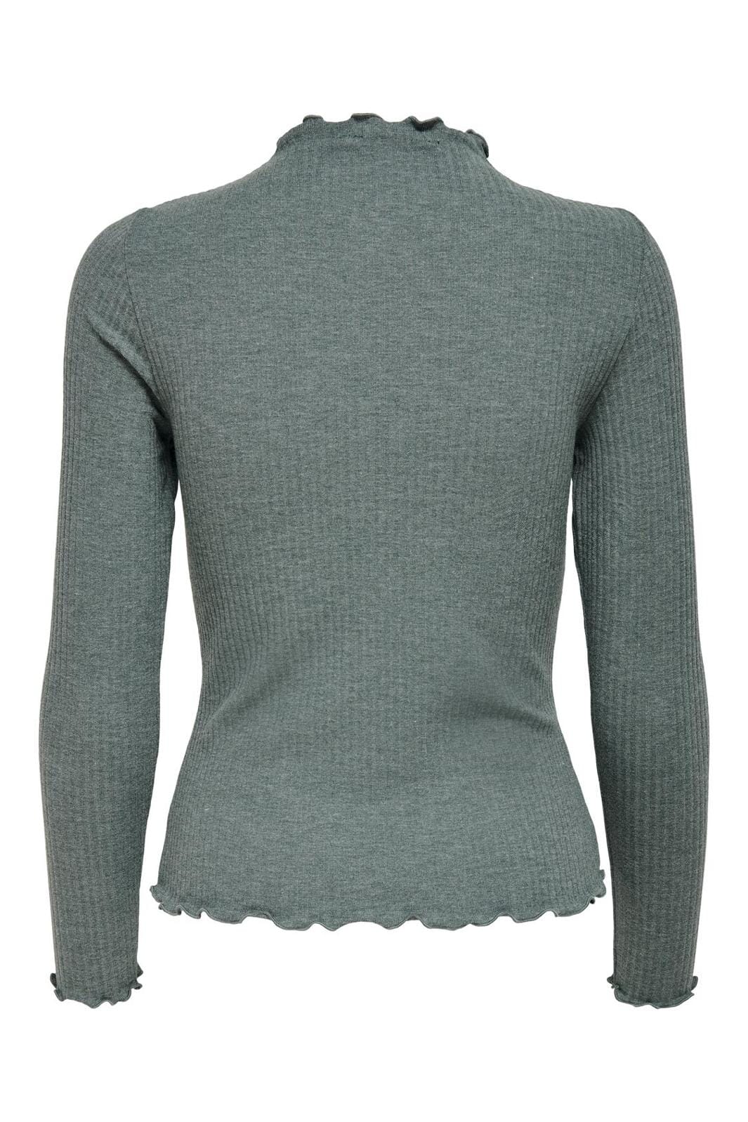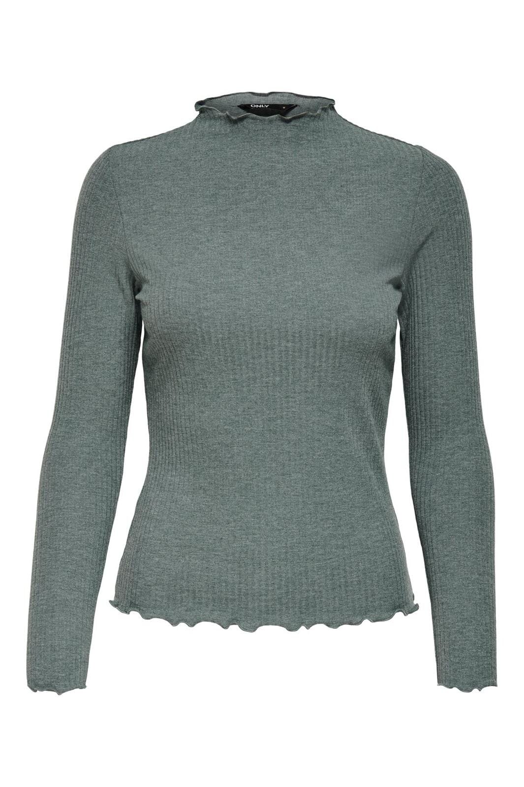 Højhalset top fra Only i meleret grøn. Toppen har lange ærmer, en ribbet struktur og flæsedetaljer ved halsen. Den har en behagelig comfort fit-pasform.