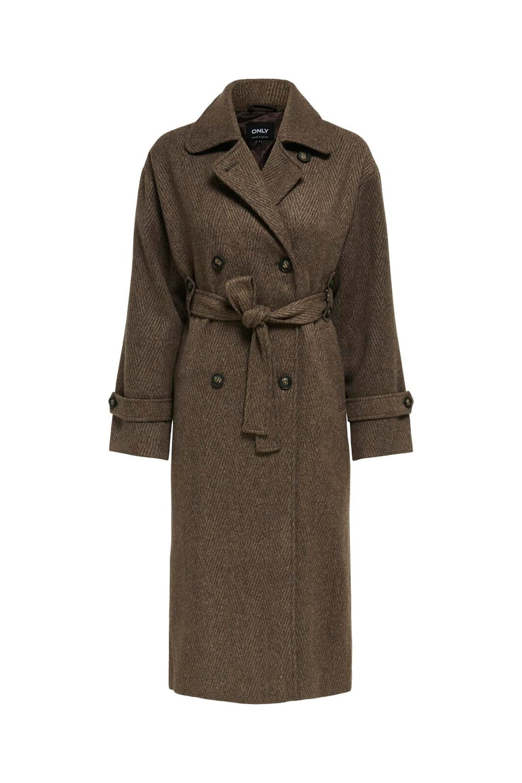 Brun frakke fra Only med sildebensmønster. Fremstillet af vævede materialer med revers halsudskæring, knapper foran og bælte i taljen. Ærmerne har justerbare kanter med knapper.