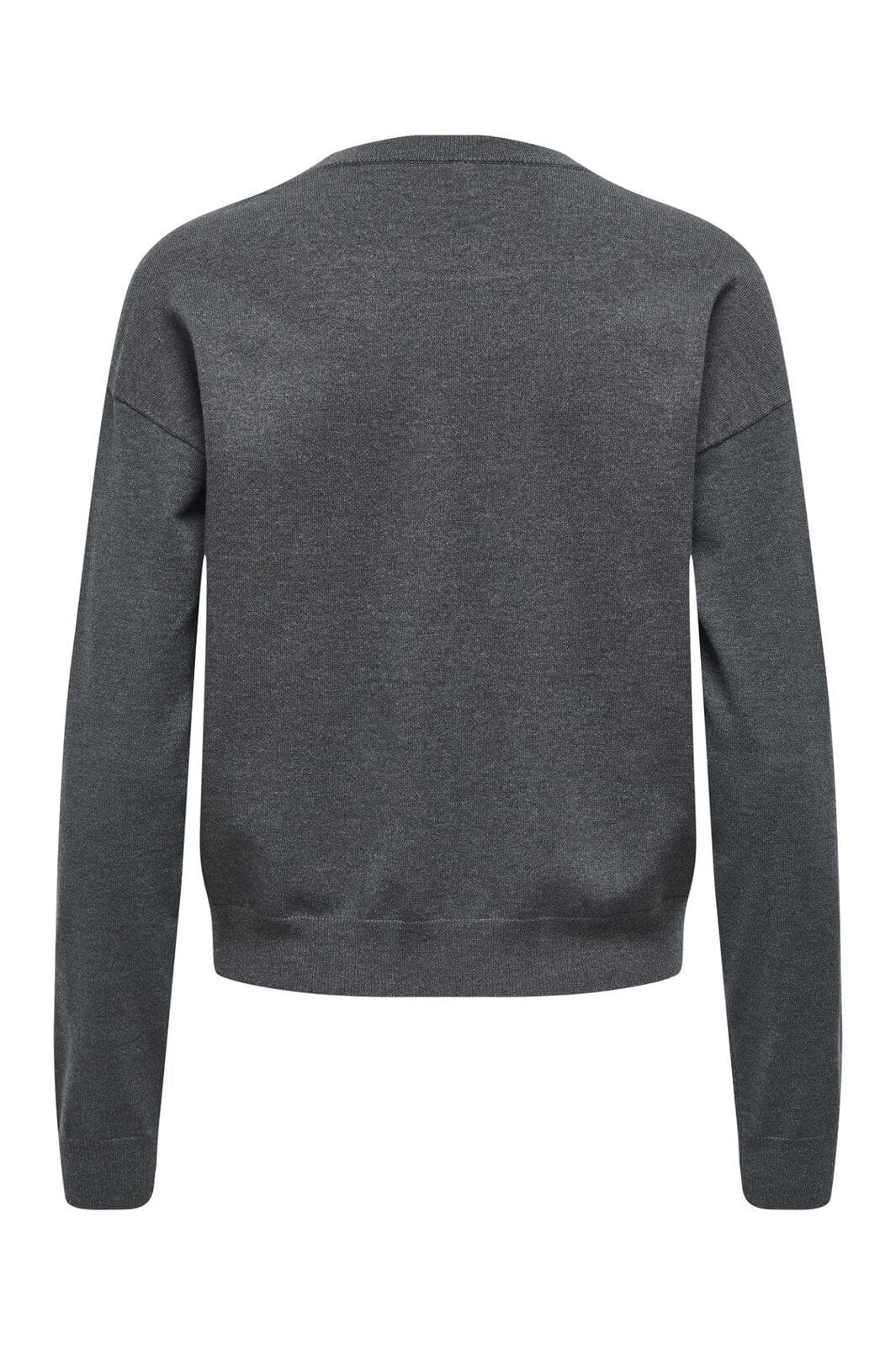 En mørkegrå striktrøje fra Only med pailletter. Farven er en meleret grå nuance, og pailletterne danner et skinnende mønster på forsiden.