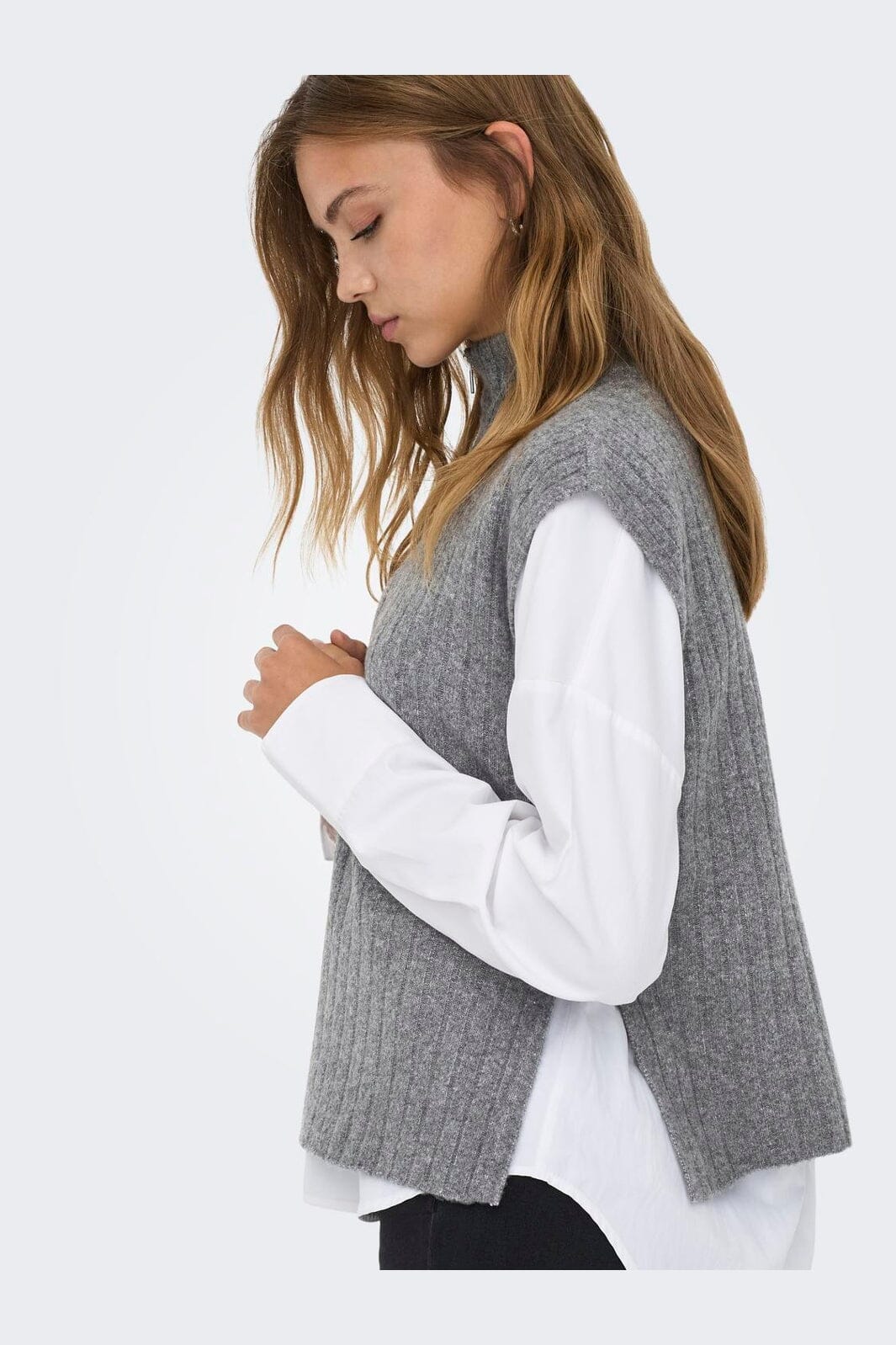 Ærmeløs strikvest fra ONLY i grå meleret. Vesten har høj hals med lynlås og en ribbet tekstur.