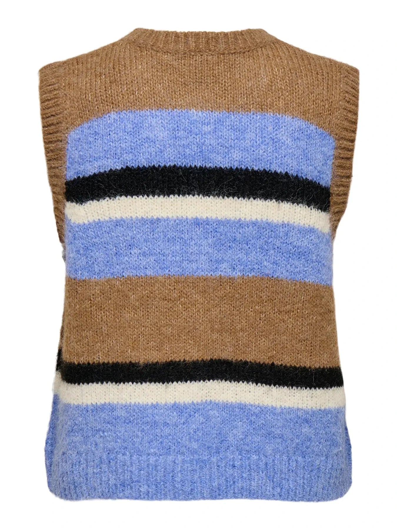 Stribet vest fra Only med brede vandrette striber i brun, lyseblå, sort og hvid. Vesten har sorte knapper og en rund halsudskæring.