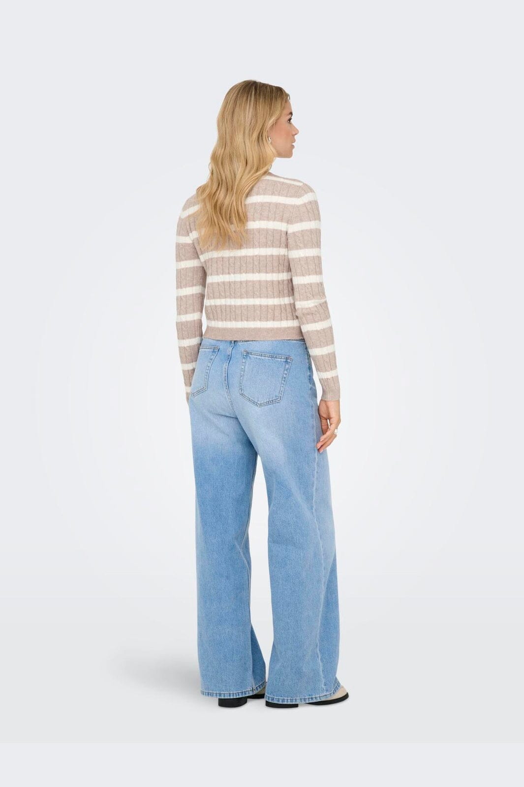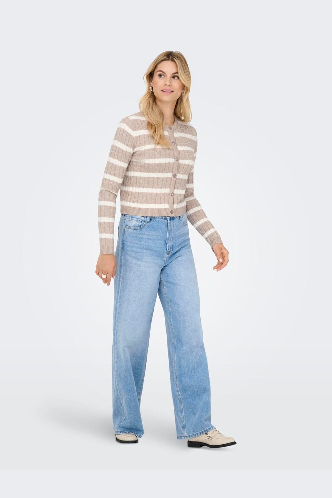 Stribet cardigan fra Only med kabelstrikmønster i beige og cremehvide nuancer. Cardiganen har knaplukning og lange ærmer med ribstrikkede manchetter.