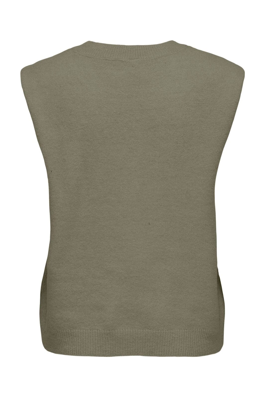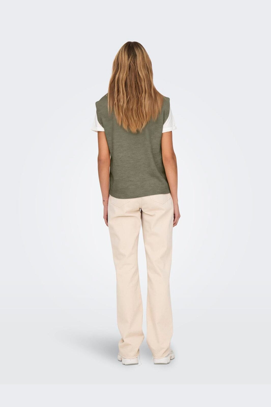 Ærmeløs vest fra Only i khakigrøn farve med broderede gyldne hjerter spredt over stoffet. Vesten har en rund halsudskæring og ribmanchetter.