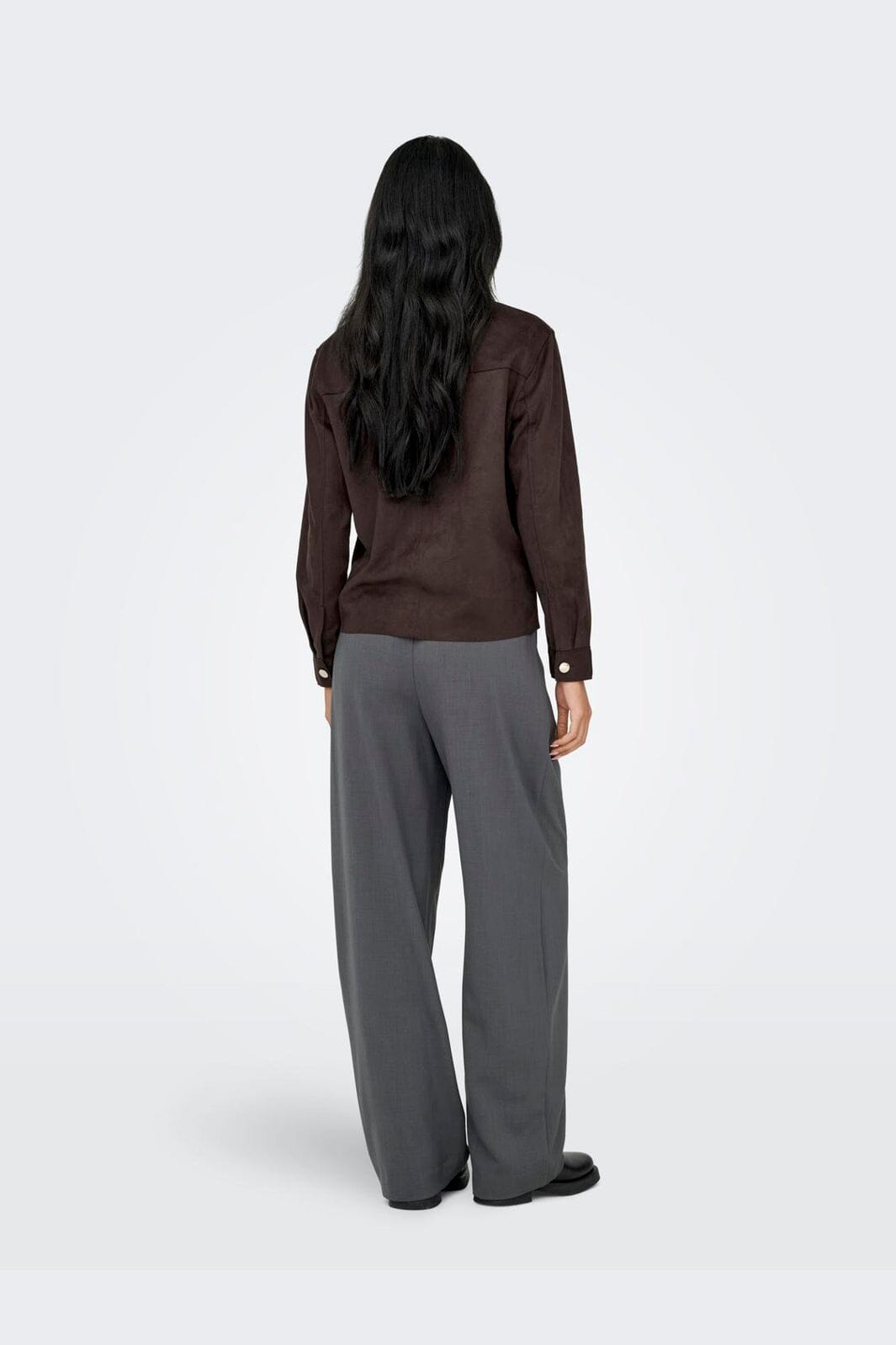 Brun skjorte fra Only, lavet af faux ruskind. Skjorten har en klassisk skjortekrave og lange ærmer med knaplukning ved manchetterne.