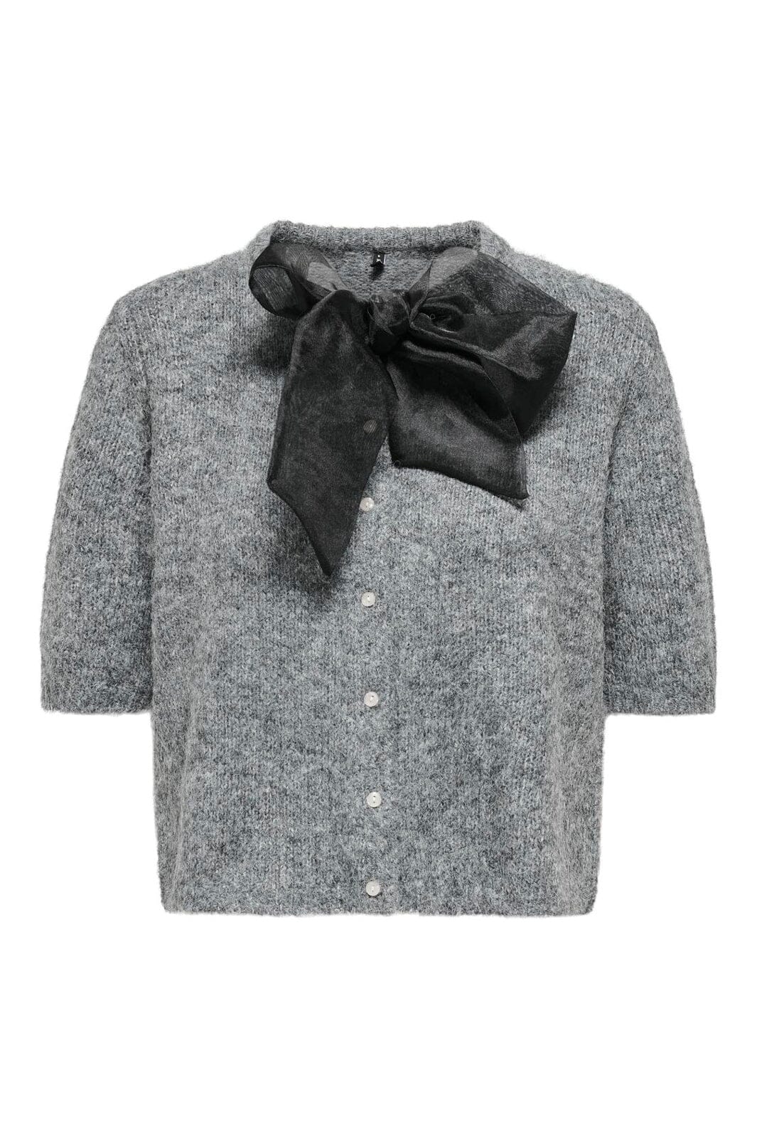 Mørkegrå cardigan fra Only med kortærmet design. Cardiganen har en stor sort sløjfe ved halsen og knapper langs midten.