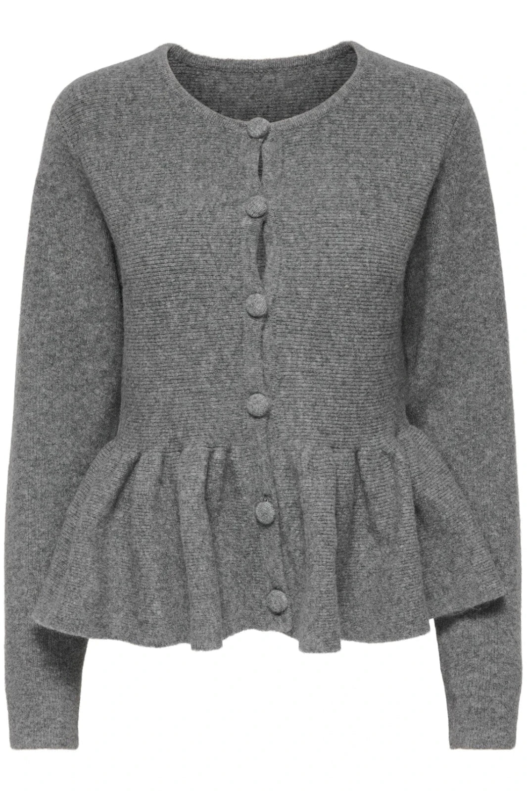 Lys grå cardigan fra Only med peplum-detalje ved taljen. Cardiganen har en knaplukning foran, lange ærmer og en rund halsudskæring.