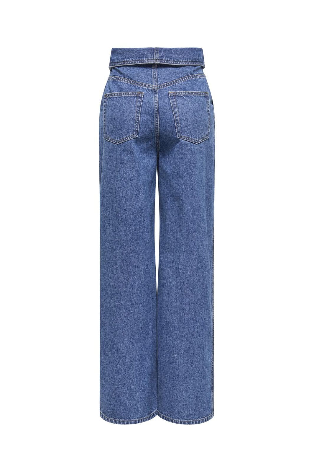 Vide jeans fra Only i mellemblå denim med et bredt bælte ved taljen. Bukserne har en løs pasform og vide ben fra hofte til ankel.