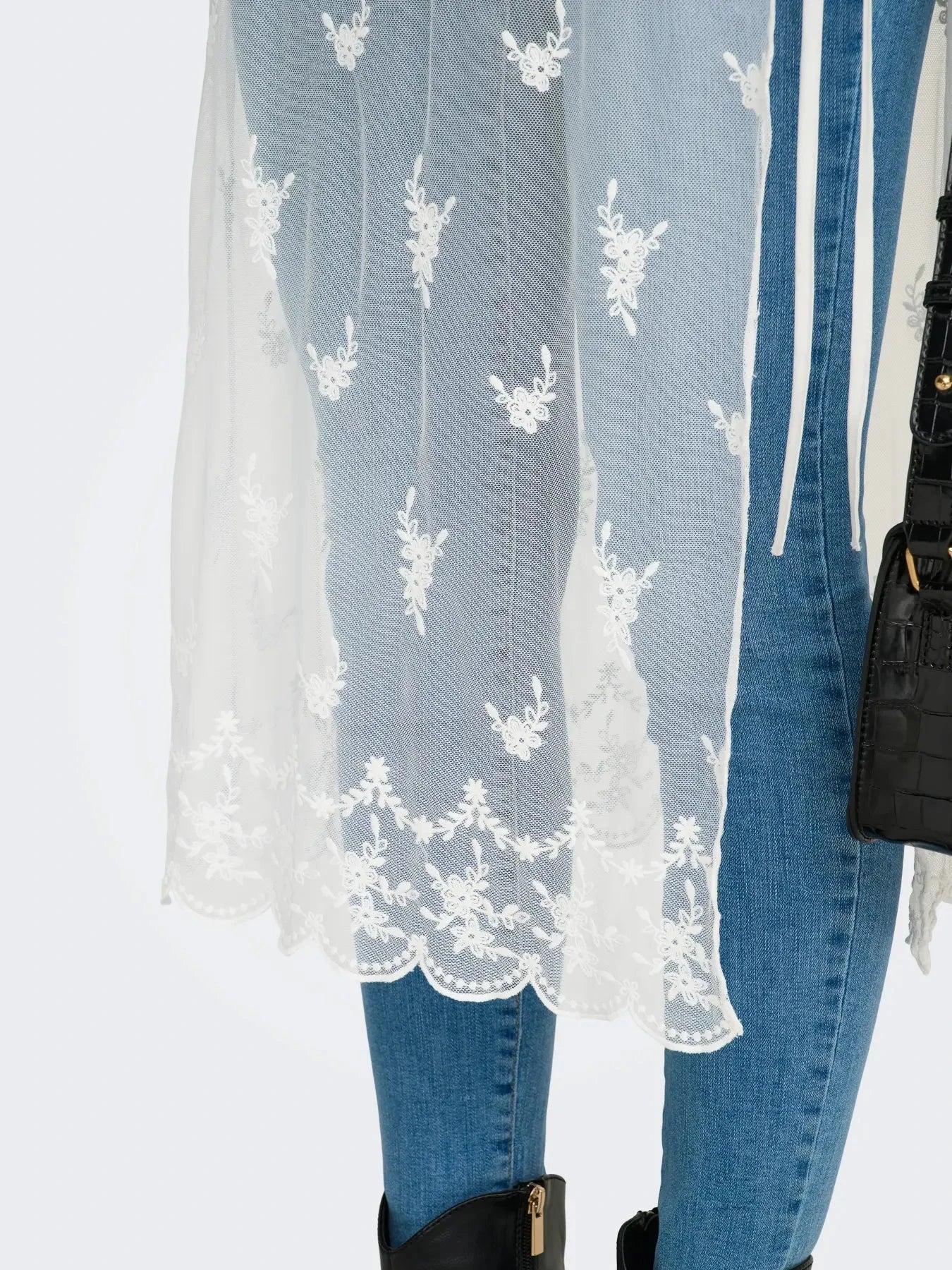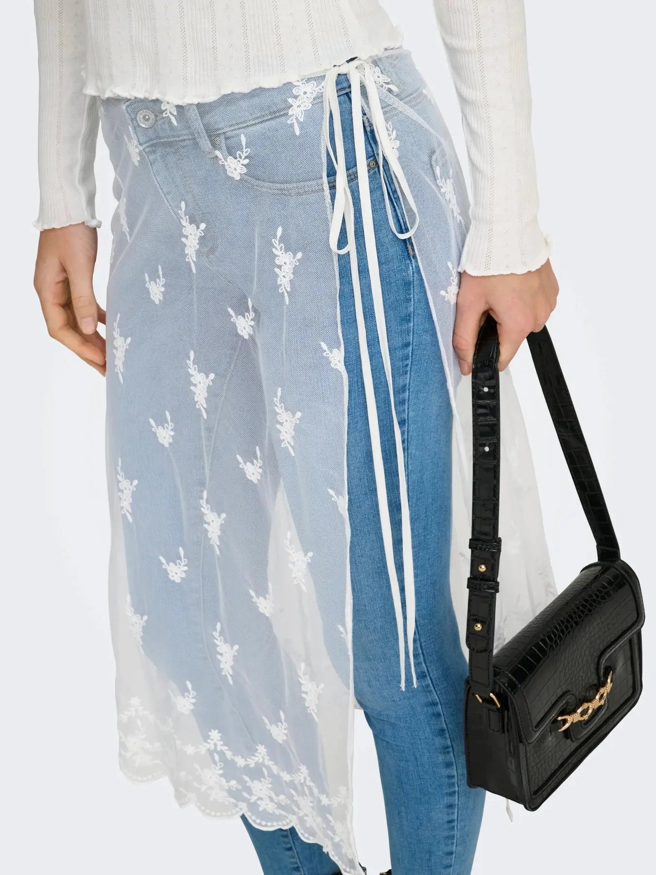 Hvid midi-nederdel fra Only, lavet af gennemsigtig mesh med blomstrede blondemønstre. Nederdelen har bindebånd i taljen og en bølget kant nederst.