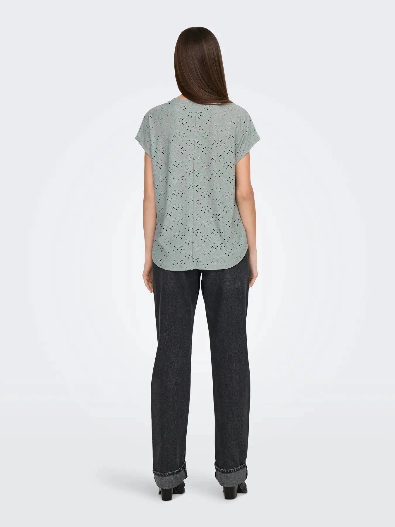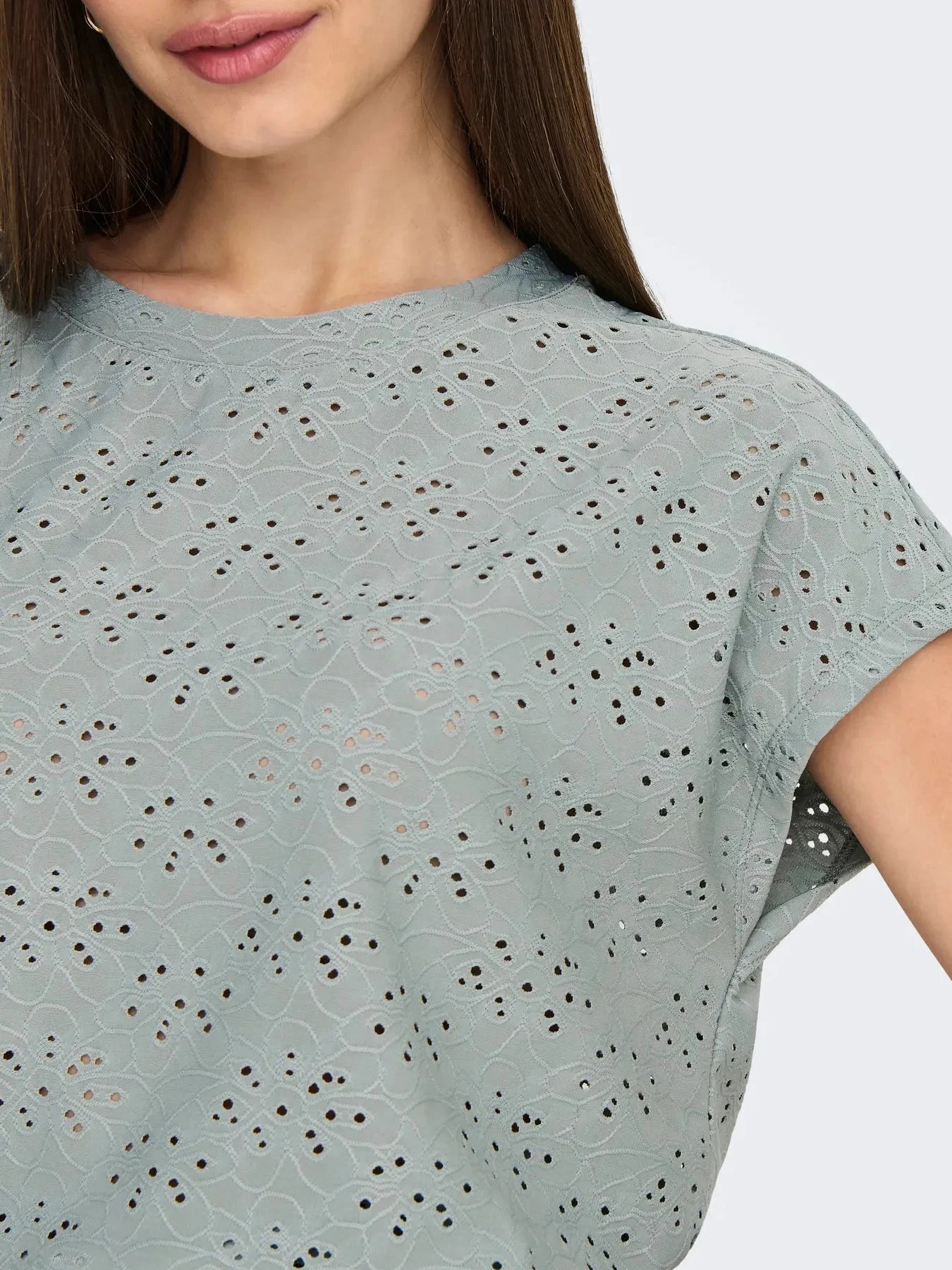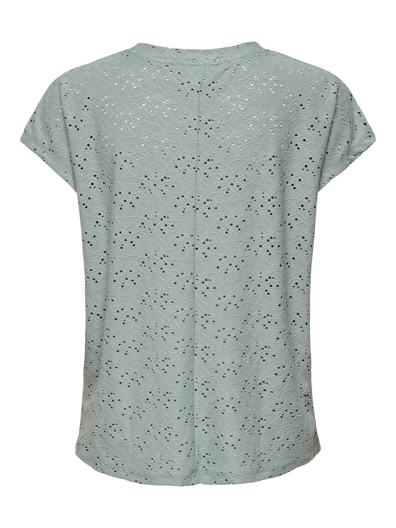 Kortærmet top fra Only i lys blågrøn med hulmønster over hele toppen. Den har en rund halsudskæring og regular fit-pasform.