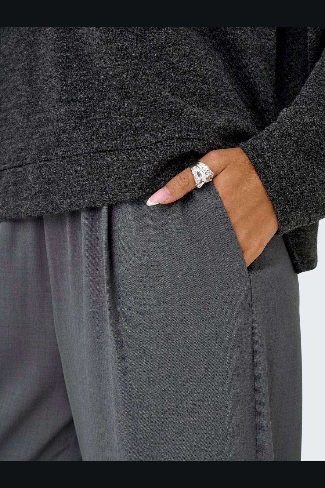 Mørkegrå bukser fra Only, lavet af genanvendt polyester. Bukserne har en høj talje og en løs pasform, der giver bevægelsesfrihed.