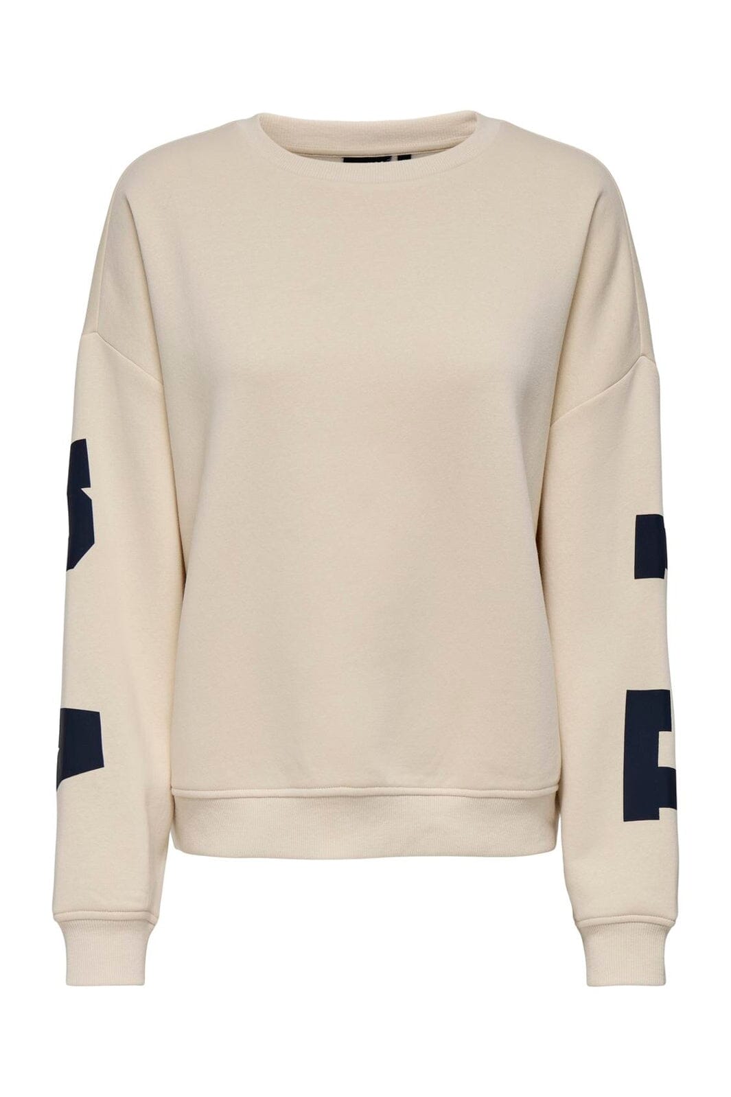 Sweatshirt fra Only i en lys beige nuance med mørkeblå print på ærmerne og ryggen. Sweatshirten har en rund hals og lange ærmer.
