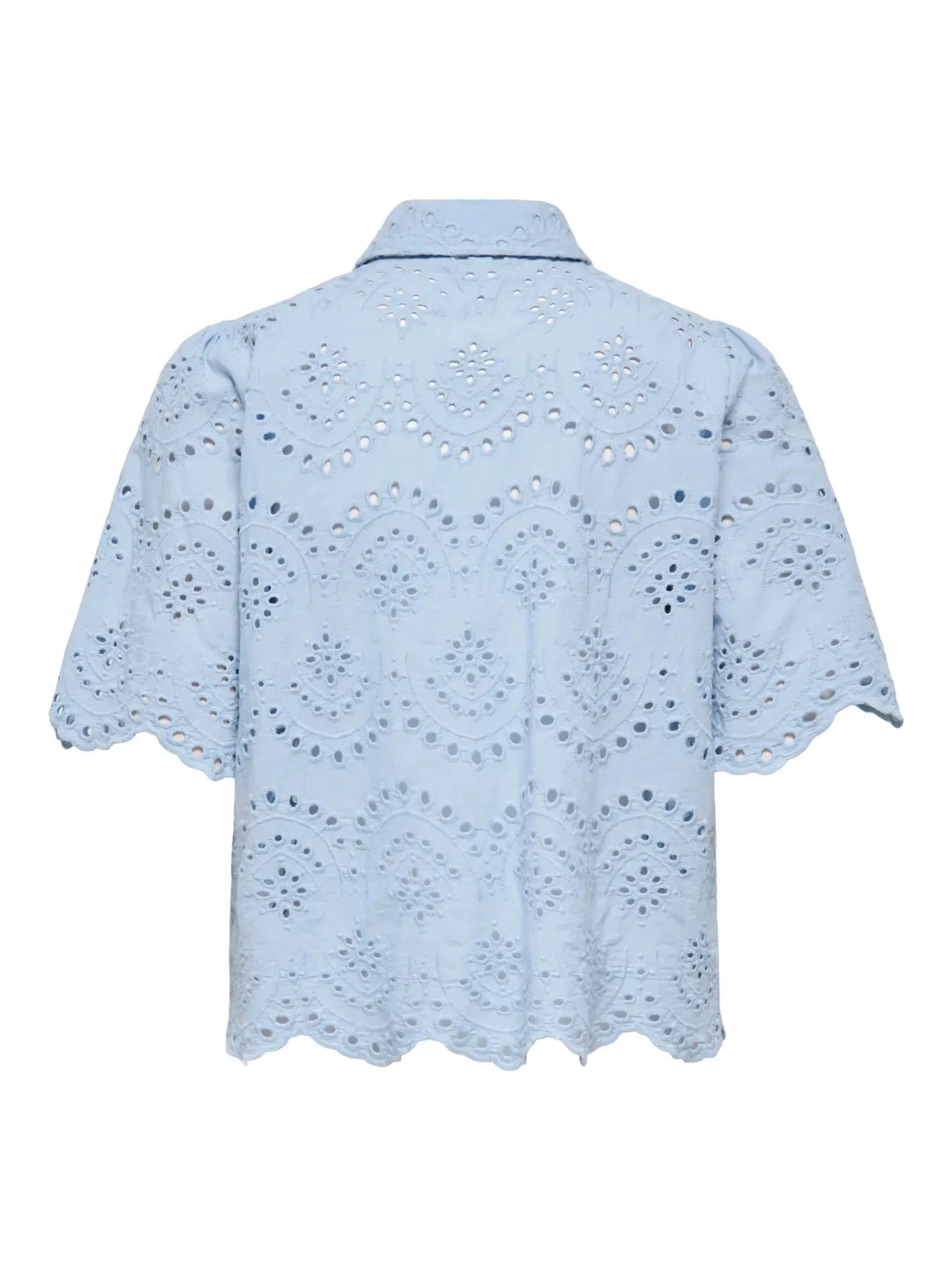 En kortærmet skjorte fra Only i lyseblå bomuld. Skjorten har broderede hulmønstre, knaplukning foran og en bølget kant ved ærmerne og forneden.