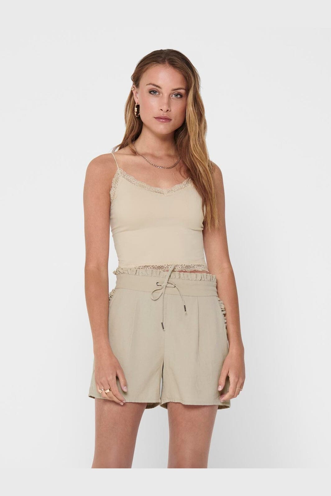 Cropped top fra Only i ferskenfarven Peach Taffy. Toppen har blondedetaljer ved halsudskæringen og kanten samt en V-hals og tynde spaghetti-stropper.