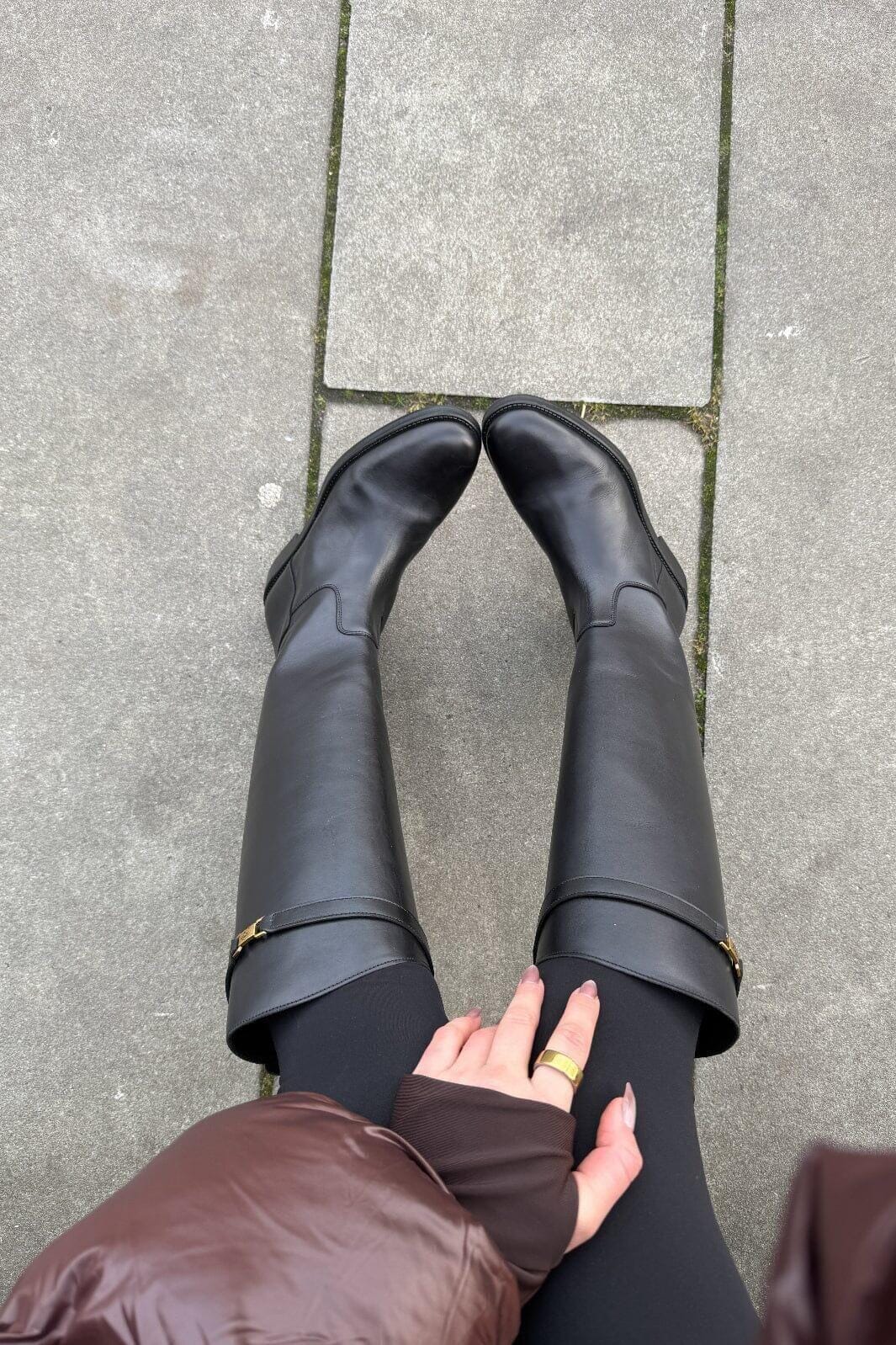 Høj støvle fra Phenumb Copenhagen, lavet af sort læder. Støvlen har et højt skaft, der dækker op til knæet, og et dekorativt spænde nær toppen.