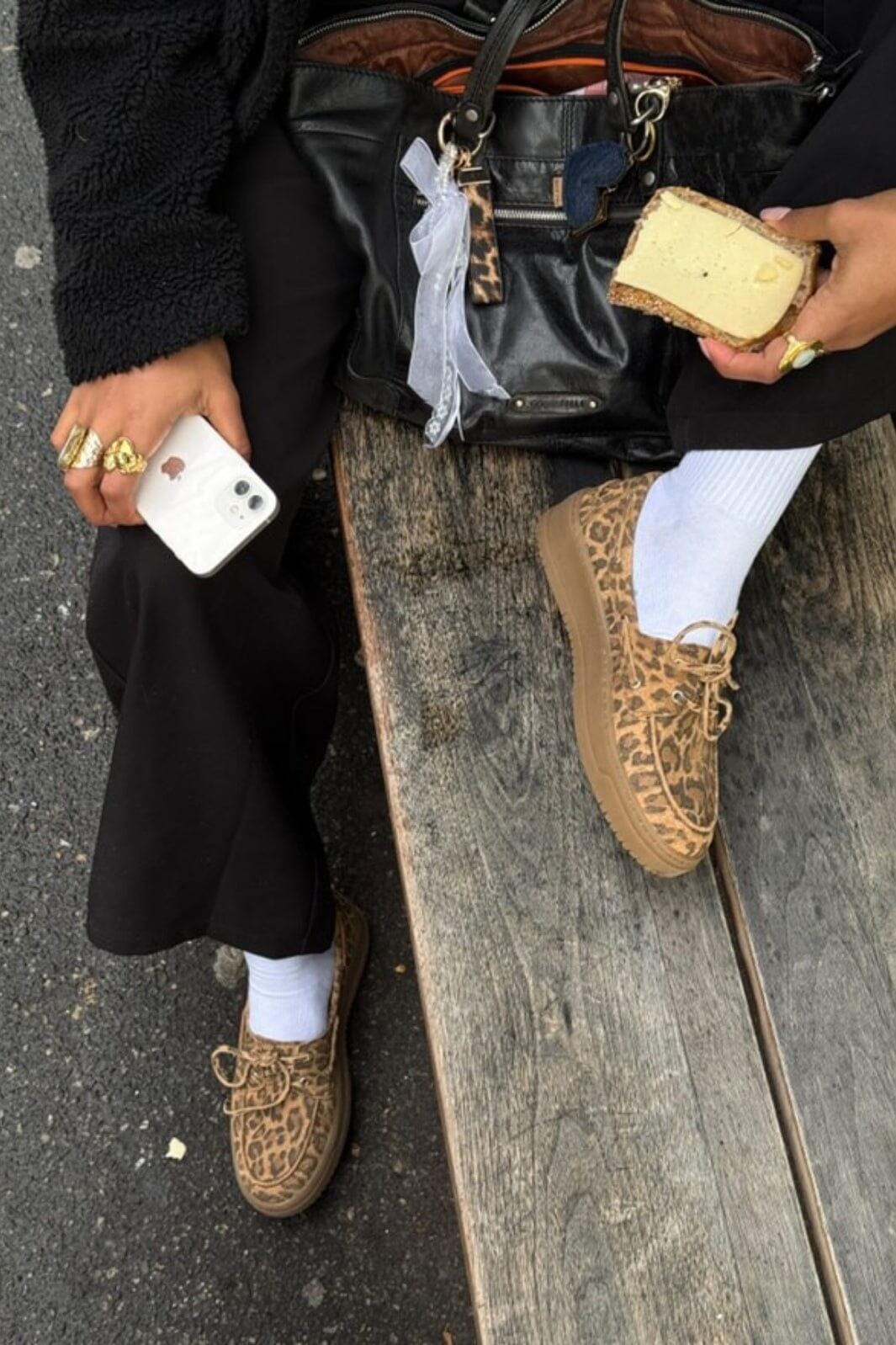 Sko i ruskind med et brunt leopardmønster. Skoene har en rund tå og snørelukning, der giver en god pasform.