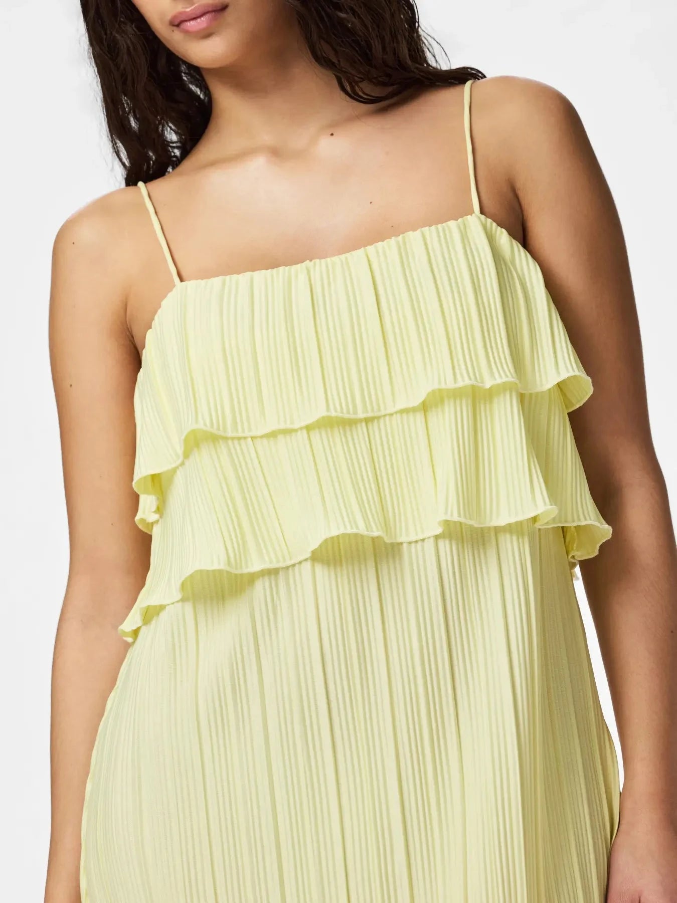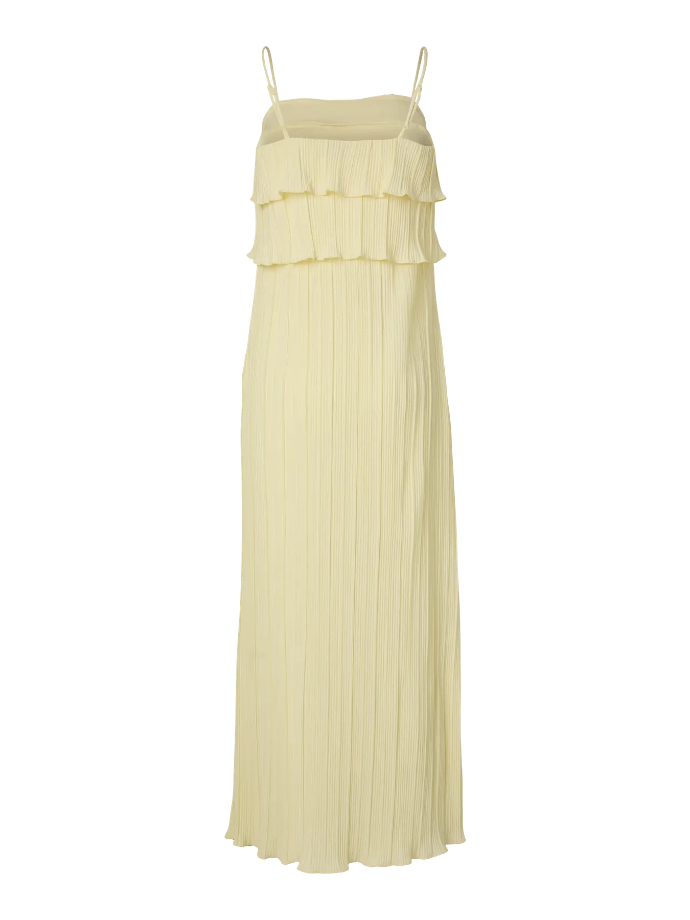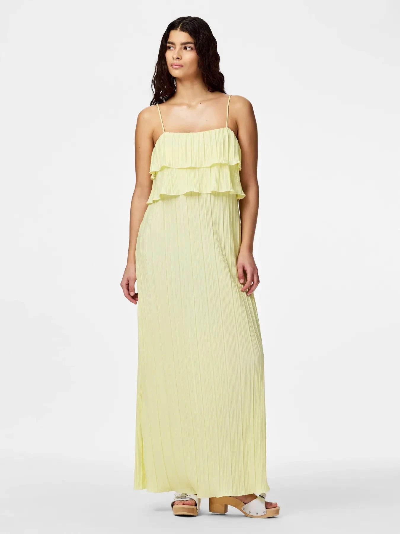 Plisseret kjole fra Pieces i en lys gul nuance. Kjolen har tynde stropper, firkantet halsudskæring og når ned til anklerne.