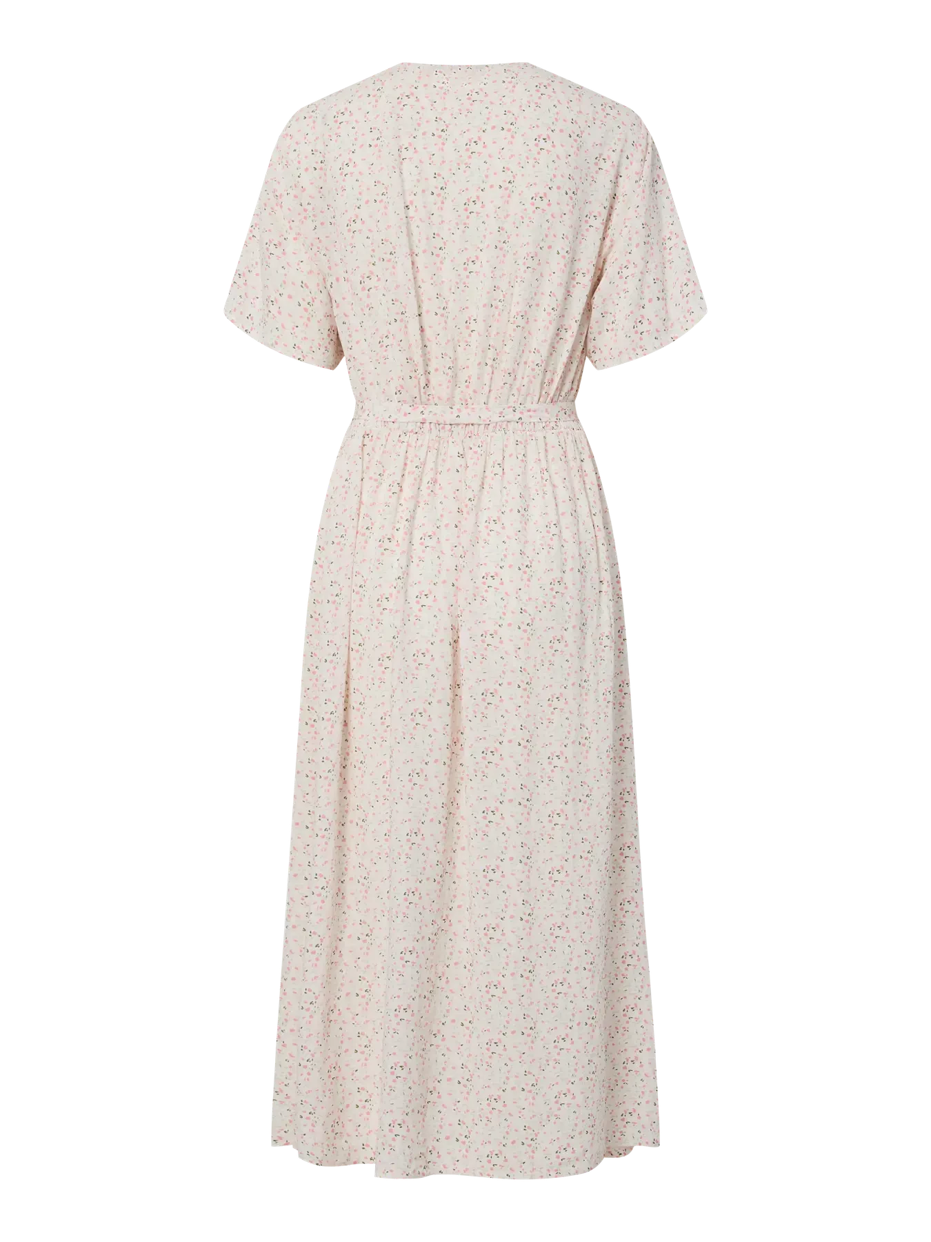 Midi-kjole fra Pieces med V-udskæring og småblomstret mønster i creme og hvid. Kjolen har korte ærmer og bindebånd i taljen.