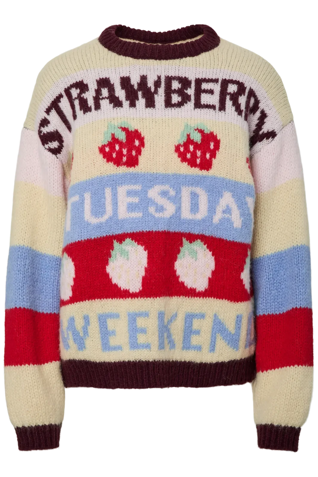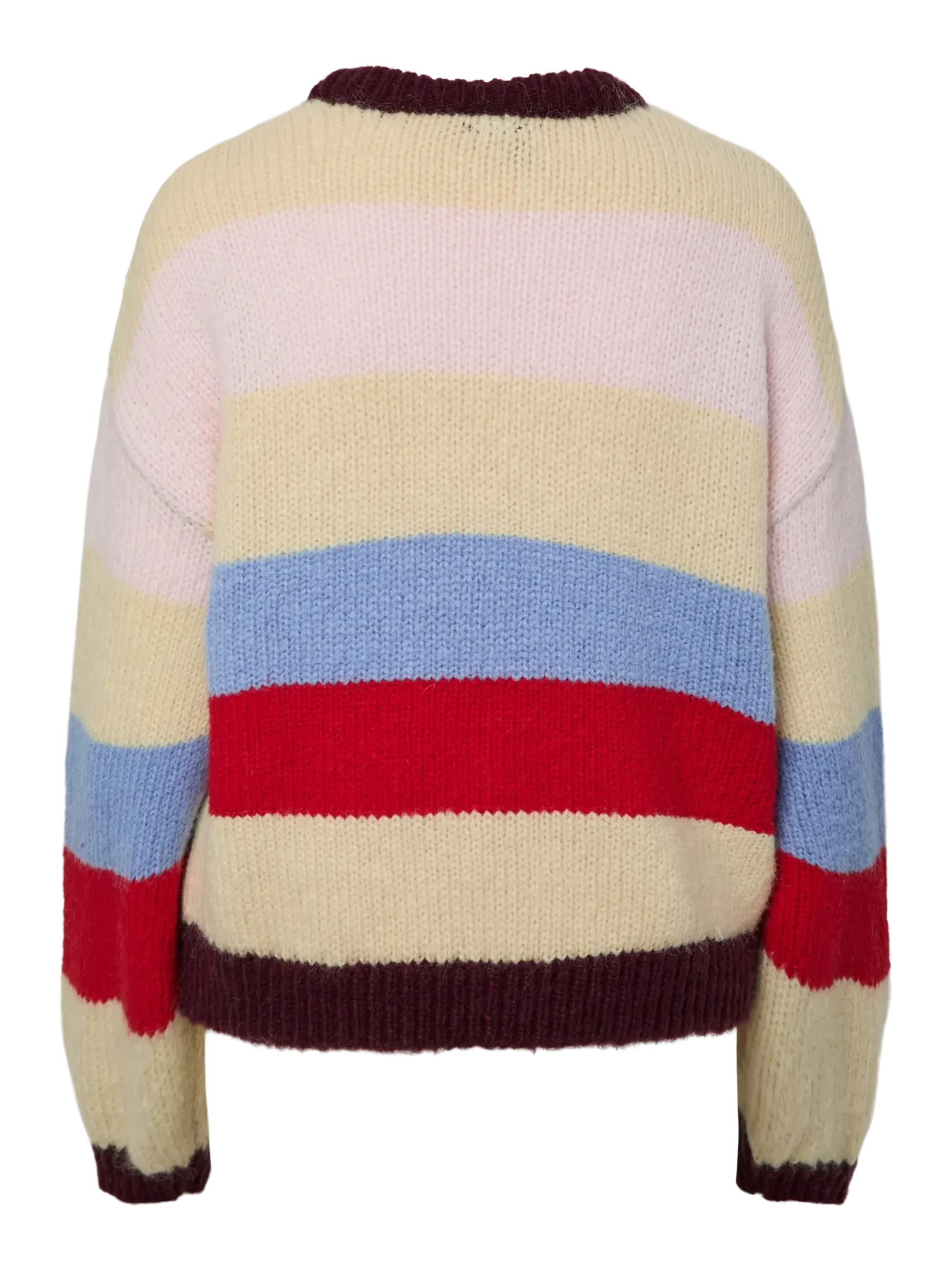 En flerfarvet striktrøje fra Pieces med grafiske elementer og tekst. Trøjen har en beige base med striber i rødt, blåt og brunt.