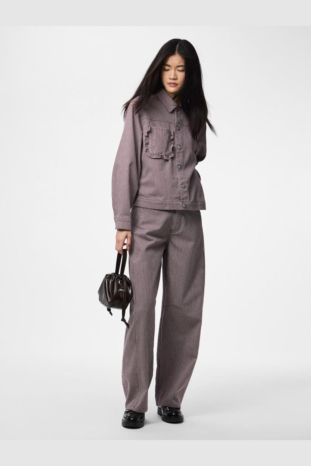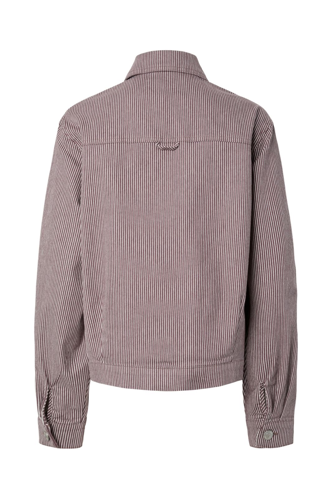 Stribet denimjakke fra Pieces i brun-grå nuancer med hvide striber. Jakken har en løs pasform og dekorative flæser på lommerne.