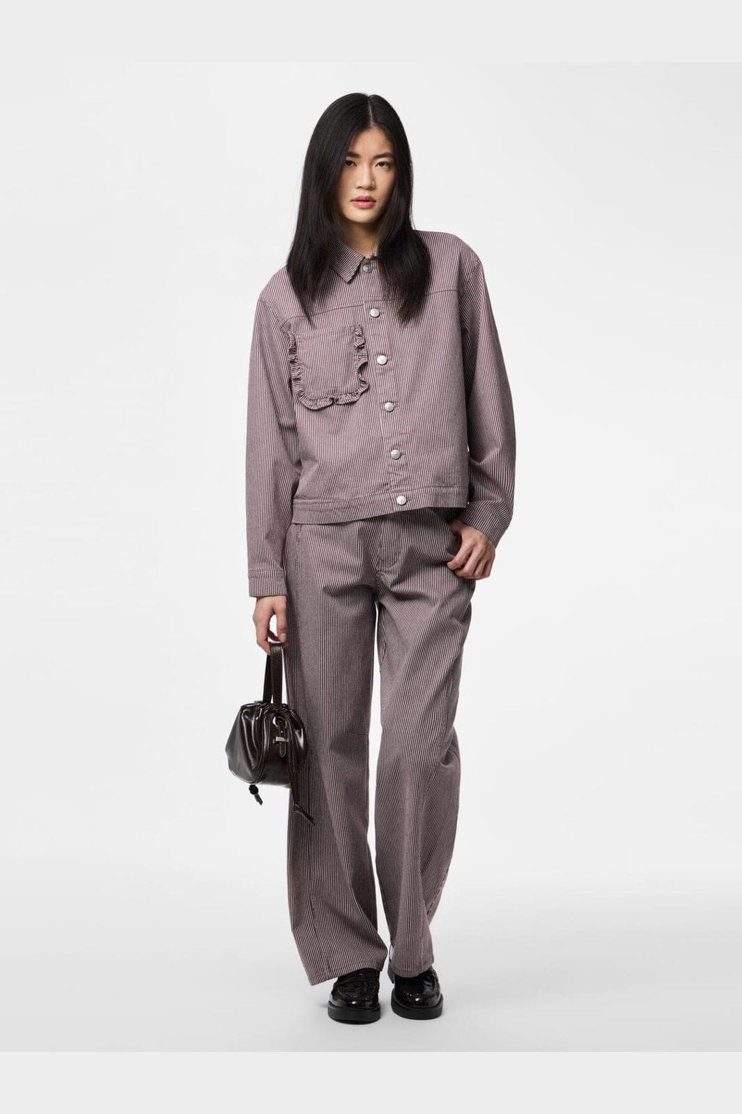 Jeans fra Pieces med stribet mønster i hvid, brun, grå og creme. Jeansene har en løs pasform og en ankel-lang længde.
