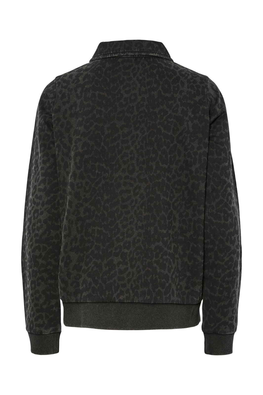Langærmet polo fra Pieces med leopardmønster i sort og acid wash-finish. Poloen har ribstrikkede manchetter og en treknaps stolpelukning foran.