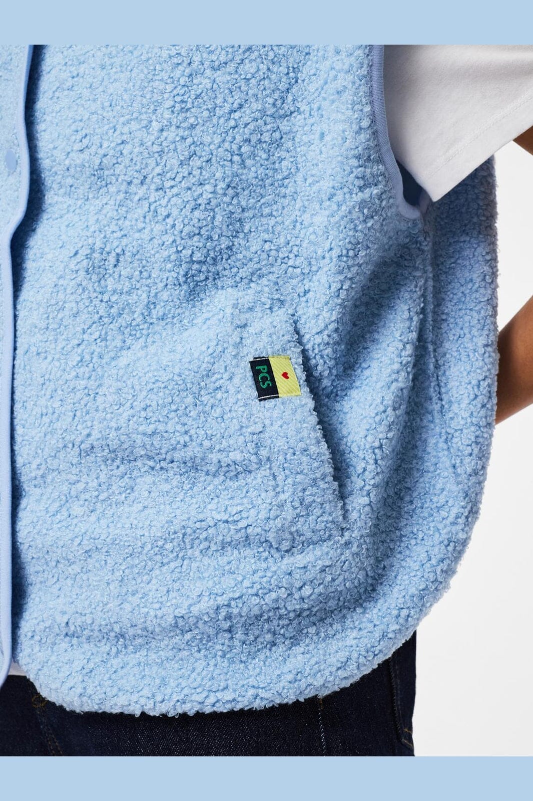 Lyseblå teddyvest fra Pieces, lavet af 100 % genanvendt polyester med en blød overflade. Vesten har V-hals og trykknaplukning.