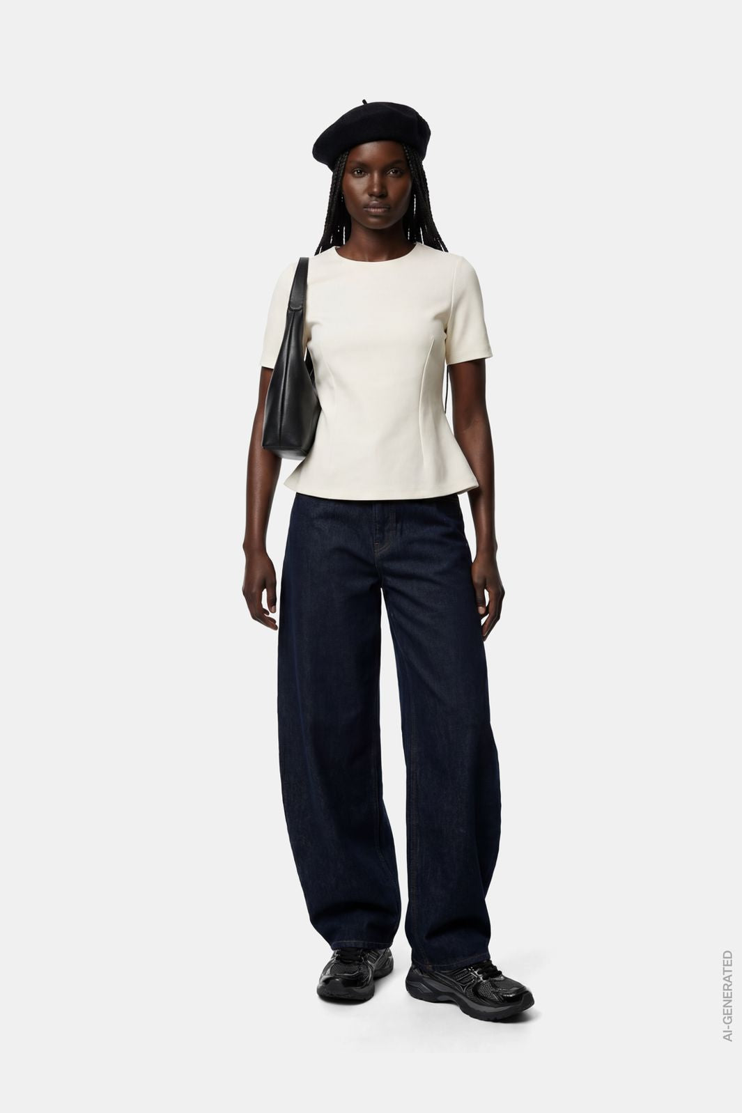 Hvid top fra Pieces, lavet af en blanding af bomuld, polyester og elastan. Toppen har en rund halsudskæring og korte ærmer.