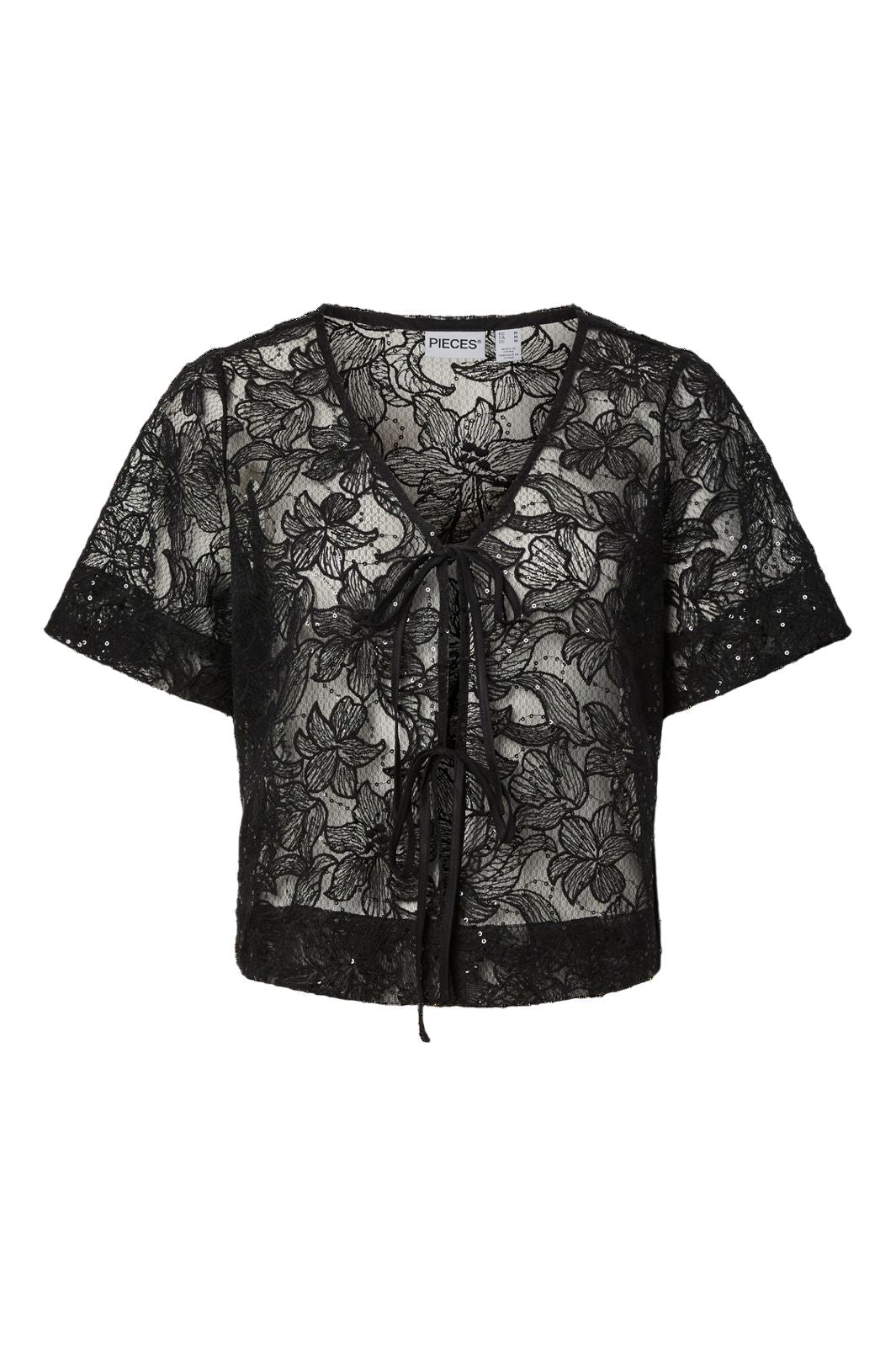 Sort top fra Pieces med v-hals og blomstret blonde. Toppen har korte ærmer og bindebånd foran med pailletter.