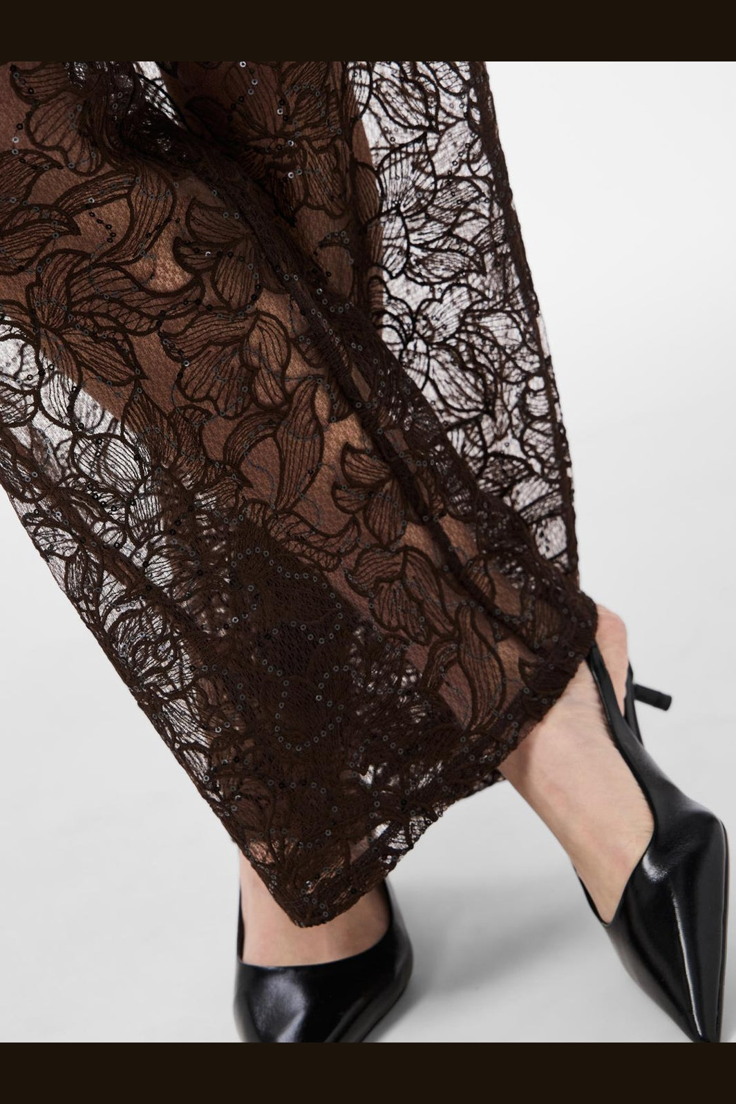 Lige bukser fra Pieces, lavet af gennemsigtig blonde med blomstermønster og pailletter i en mørk brun nuance.